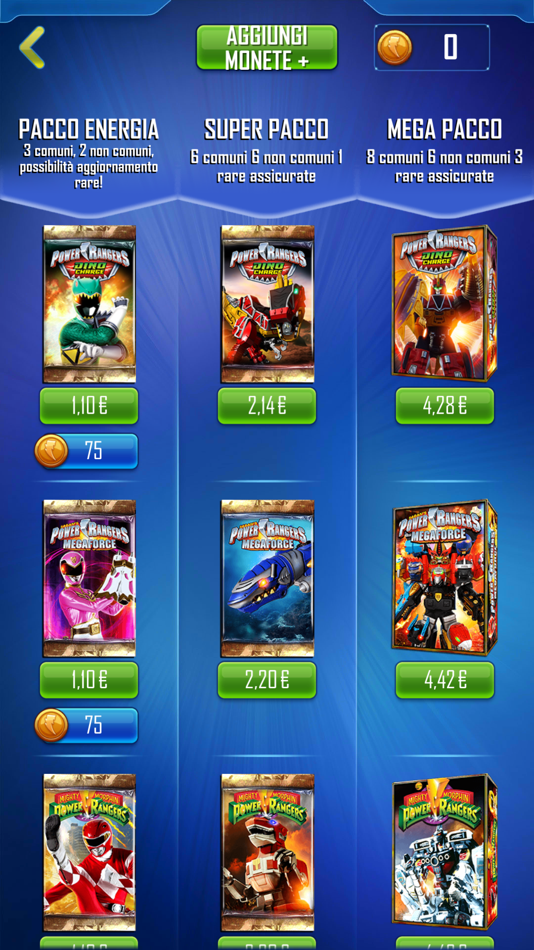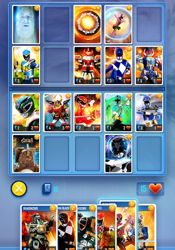 Sono presenti oltre 250 carte diverse ispirate a tutte le stagioni della serie quali ranger, zord, armi ed abilità che permettono di mettere in atto infinite strategie di gioco, utilizzabili anche nella modalità online che permette di sfidare gli amici in appassionanti battaglie.