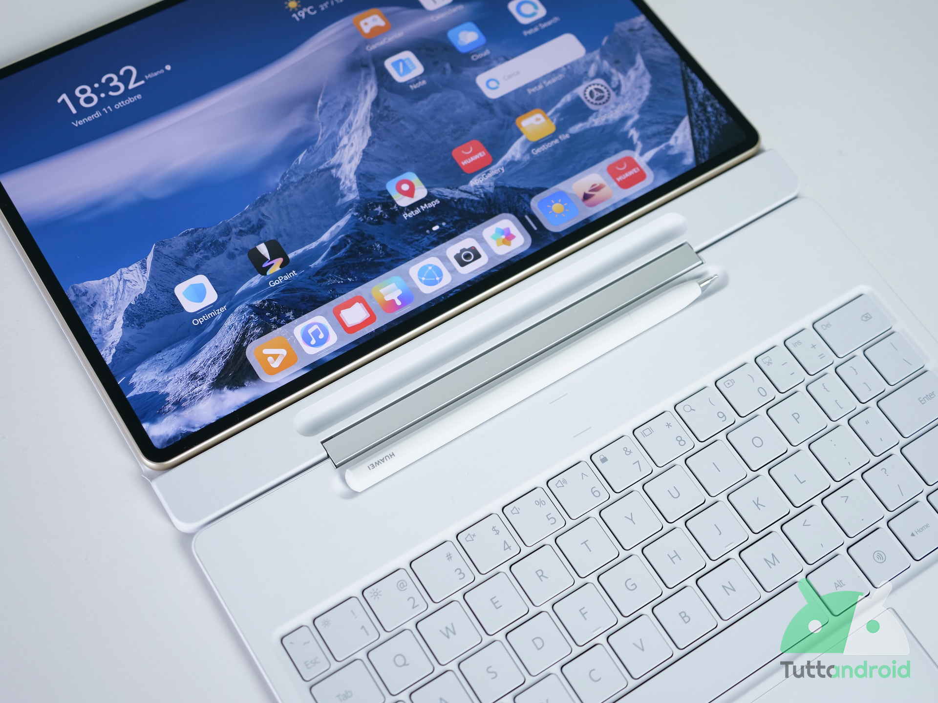 Oltre al tablet stesso, Huawei ha progettato una tastiera accessoria chiamata Glide, che trasforma il MatePad Pro in un vero e proprio strumento di produttività. La tastiera si aggancia magneticamente al tablet e offre diverse angolazioni di supporto, consentendo di utilizzare il dispositivo in modalità laptop per scrivere o lavorare comodamente in mobilità. La caratteristica più sorprendente è la solidità di questo accessorio, tanto nella costruzione quanto nel meccanismo di angolazione, da farlo sembrare un tutt’uno.
