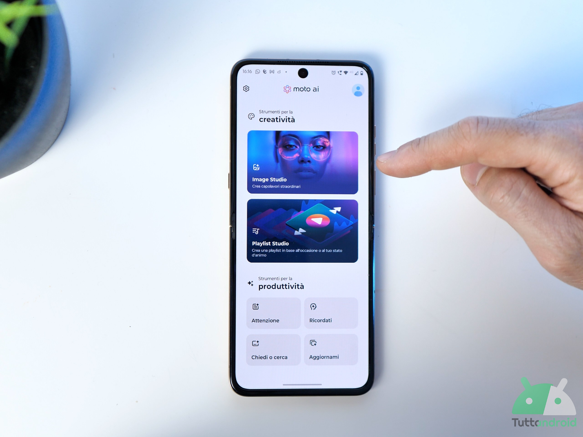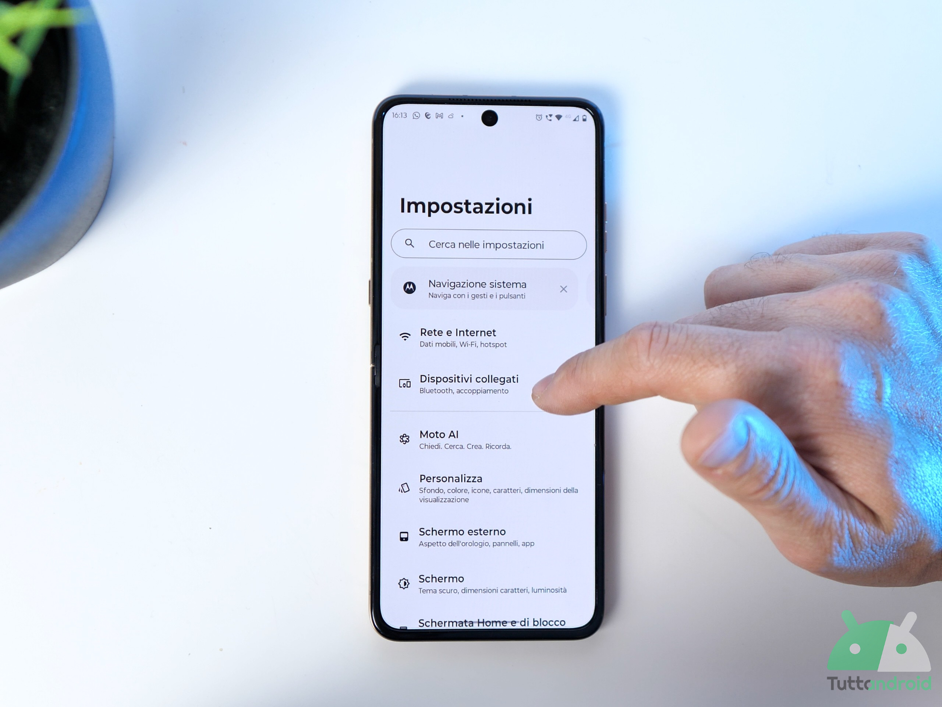 Sempre dal display esterno si può accedere all’intelligenza artificiale Moto AI, che si attiva tramite un gesto o semplicemente guardando verso le due fotocamere frontali. È una funzione abilitabile dalle impostazioni e che, nei nostri test, si è rivelata rapida e precisa. Presente anche la modalità scrivania, che consente di visualizzare l’orario o una riproduzione a scelta di immagini e testi, trasformando lo smartphone in una sorta di mini cornice smart da tenere sul tavolo.