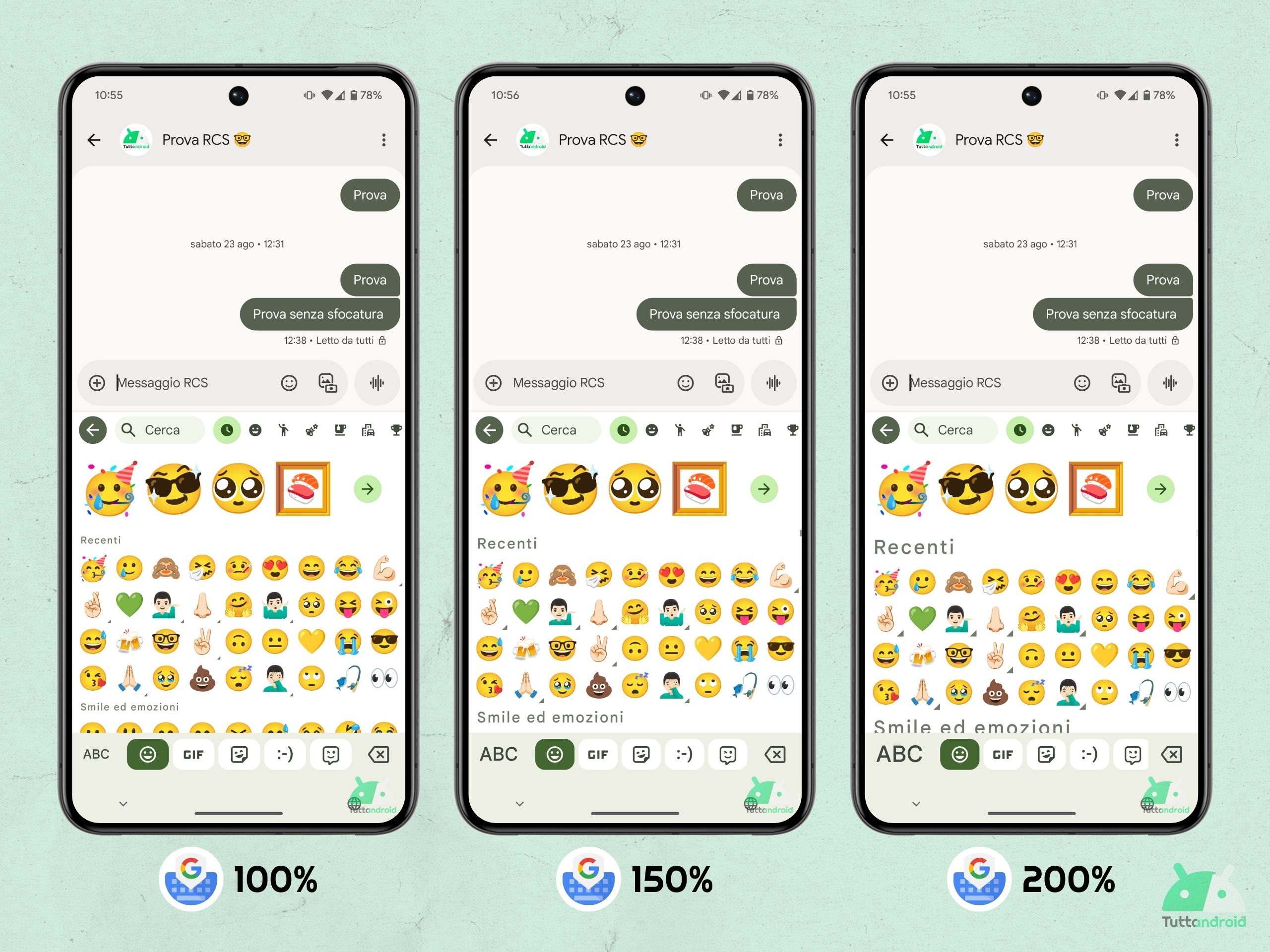 Modificando le Dimensioni carattere della Gboard, non andremo soltanto a modificare il testo nelle lettere e tra i suggerimenti. Come mostrano le seguenti immagini, ad esempio, verranno modificate anche le etichette dei vari strumenti e tutte le scritte presenti nei vari selettori (ad esempio quello per le emoji).