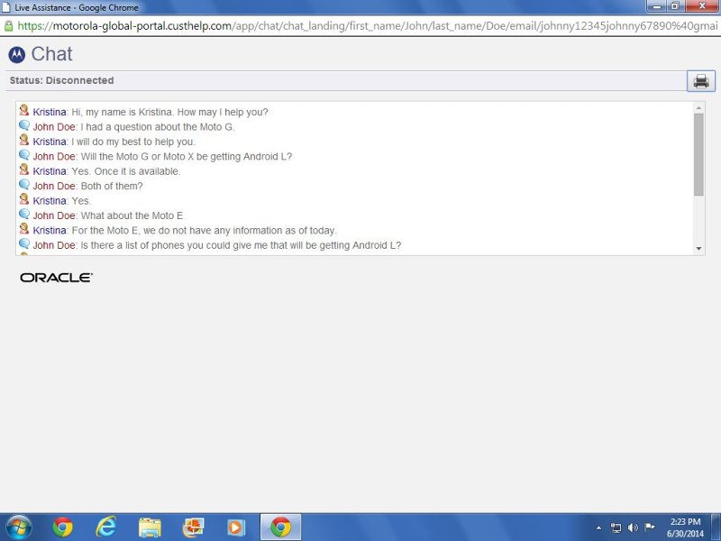 Kristina, l’operatore di turno, avrebbe confermato all’utente che Moto G e Moto X riceveranno l’aggiornamento alla prossima versione del robottino verde, mentre avrebbe risposto di non avere informazioni su Moto E. Apparentemente la conferma sembra attendibile e ufficiale, ma c’è da tenere in considerazione alcuni aspetti: l’intera conversazione potrebbe essere un falso oppure l’operatore potrebbe non essere ben informato sulla questione aggiornamenti, il che non sarebbe la prima volta.
