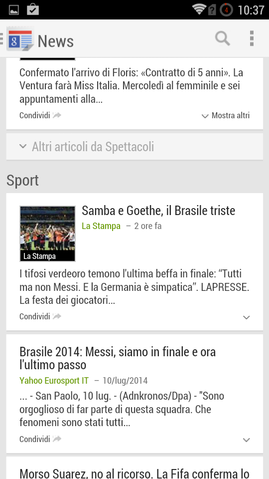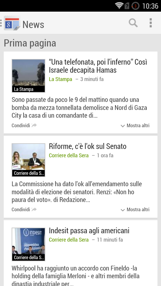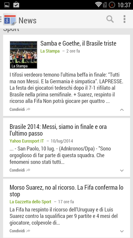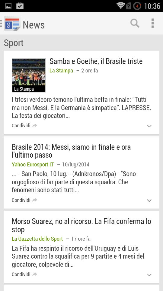 L’interfaccia è adesso del tutto diversa ed è praticamente ispirata a quella di Google Now, per cui troviamo delle schede bianche leggermente in rilievo che possono essere espanse. Non manca, ovviamente, il tanto apprezzato NavigationDrawer, che ci permette di navigare fra le varie categorie di notizie con un tocco.