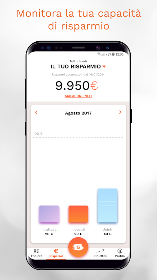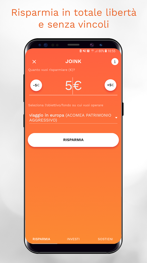 L’app permette di impostare delle somme da raggiungere versando anche solo cinque euro con ogni click (Joink) senza vincoli di ricorrenza o durata.
