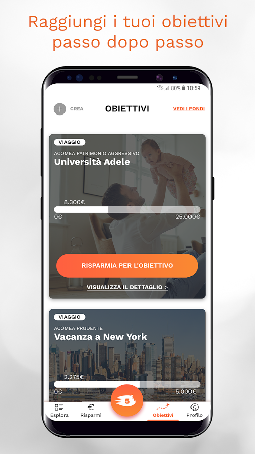 E’ comunque possibile impostare delle regole automatiche per essere spronati a raggiungere più velocemente gli obbiettivi e scegliere tra i profili Prudente, Dinamico e Aggressivo, affidando il capitale a AcomeA SGR, una Società di Gestione del Risparmio.