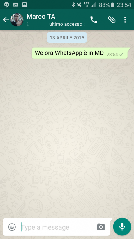 La barra di stato si adatta al colore del software (anch’esso diverso rispetto al passato) e l’header si nasconde quando si scorrono gli elenchi verso il basso. Per abilitare Whatsapp in Material Design è sufficiente scaricare l’apk della beta dal sito ufficiale. La versione attuale è la 2.12.34 (ma va bene anche la 2.12.33).