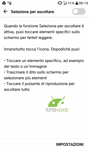 Il primo consente di accedere e controllare il proprio smartphone utilizzando sensori, pulsanti o tastiere esterne al posto del touchscreen. “Seleziona” permette invece di ascoltare la lettura o la descrizione di un elemento per l’appunto selezionato.