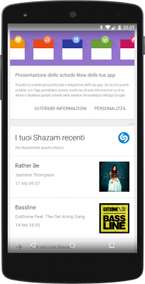 All’apertura di Google Now è possibile notare una nuova scheda che illustra l’integrazione delle applicazioni terze, spiegando brevemente di che si tratta e suggerendo in che modo attivarla o disattivarla. E’ bene che vi ricordiamo che saranno mostrate, almeno per ora, le schede relative solamente ad alcune applicazioni selezionate da Google e quindi non a tutte quelle installate nel vostro dispositivo.