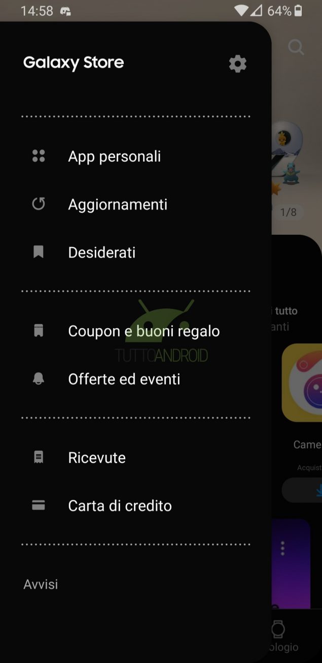 L’aggiornamento del Samsung Galaxy Store porta alcuni miglioramenti generali all’app: tra questi vale la pena citare il nuovo menu accessibile tramite swipe verso destra che permette di raggiungere più facilmente la lista di app scaricate e di quelle da aggiornare, oltre a tutte le altre opzioni prima accessibili tramite i tre punti in alto a destra.