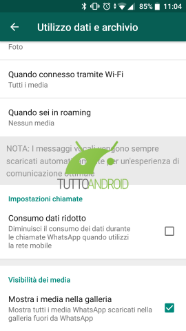 Sono due, quindi, le novità di questo nuovo update e promettono di tornare piuttosto utili nell’uso di tutti i giorni. La nuova feature relativa alla visibilità dei contenuti multimediali all’interno della galleria permette all’utente di scegliere se mostrare oppure nascondere i media condivisi. La relativa opzione può agevolmente essere modificata accedendo alle Impostazioni di WhatsApp, alla voce “Utilizzo dati e archivio”, dove è stata inserita la nuova sezione “Visibilità dei media“, dove è possibile abilitare oppure no “Mostra i media nella galleria“, corredata della didascalia esplicativa “Mostra tutti i media WhatsApp scaricati nella galleria fuori da WhatsApp“.