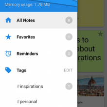 Tra le numerose funzioni presenti segnaliamo la possibilità di utilizzare diversi colori per le note, impostare i relativi promemoria (singoli o ricorrenti), organizzare le note per tag e sincronizzarle con Dropbox e Google Drive via Wi-Fi.
