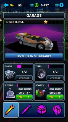 E’ disponibile un’ampia gamma di auto con caratteristiche tecniche uniche in termini di motore, pneumatici, peso e boost, che possono essere personalizzate nell’estetica e potenziate grazie al contenuto delle casse, al fine di percorrere la maggiore distanza possibile entro il tempo a disposizione.