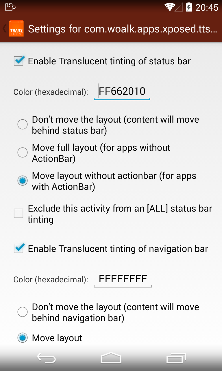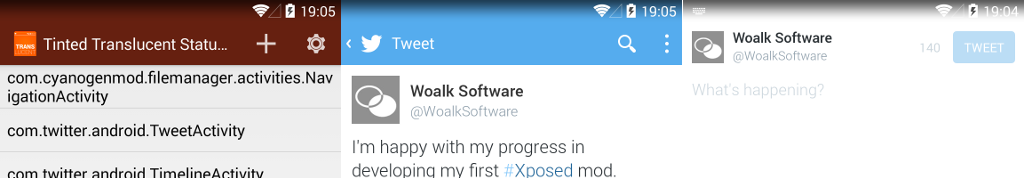 Tinted Translucent StatusBar è un nuovo modulo Xposed per ora in fase Beta che permette agli utenti che hanno installato ed attivo Xposed Framework di modificare il colore e la trasparenza della barra di stato e di quella di navigazione in qualsiasi applicazione.