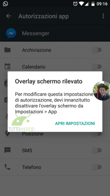 Se vogliamo modificare l’Autorizzazione di un’applicazione, qualsiasi essa sia, e nel contempo è aperta una Chat head, ovvero una bolla in primo piano, di un’applicazione, come, ad esempio, Facebook Messenger, oppure è in esecuzione un servizio di un’applicazione che agisce sulla gestione del display, come, ad esempio, Twilight e Clean Master.