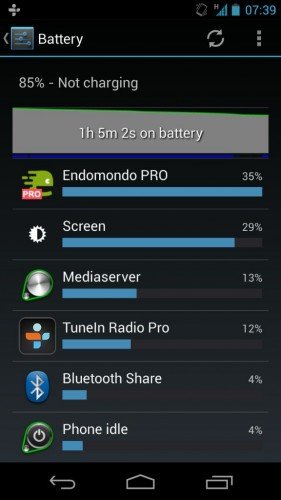 Siamo davvero sorpresi di vedere che l’utente di Xda che ha postato una screenshot  l’ha introdotta dicendo che ha usato Endomondo, ha ascoltato la musica tramite bluetooth stereo usando TuneIn Radio e, quindi, aveva la connessione dati attiva, consumando solo il 15% della batteria del suo Galaxy Nexus contro il 35% di prima. A voi la prova di quanto appena detto.