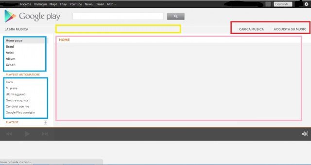 Importante è segnalarvi che, come avrete modo di vedere durante l”utilizzo del servizio, nel riquadro giallo si andrà a leggere le informazioni sulle tracce che il nostro computer sta caricando sul cloud musicale. Ed a destra, se non abbiamo già il client per caricare la musica lo potremo scaricare da lì, oppure recarci nello store della musica. Store che si presenta in modo del tutto identico allo store delle applicazioni web, ma il dettaglio sta volta è riferito alle canzoni, agli album, agli artisti ed al genere.