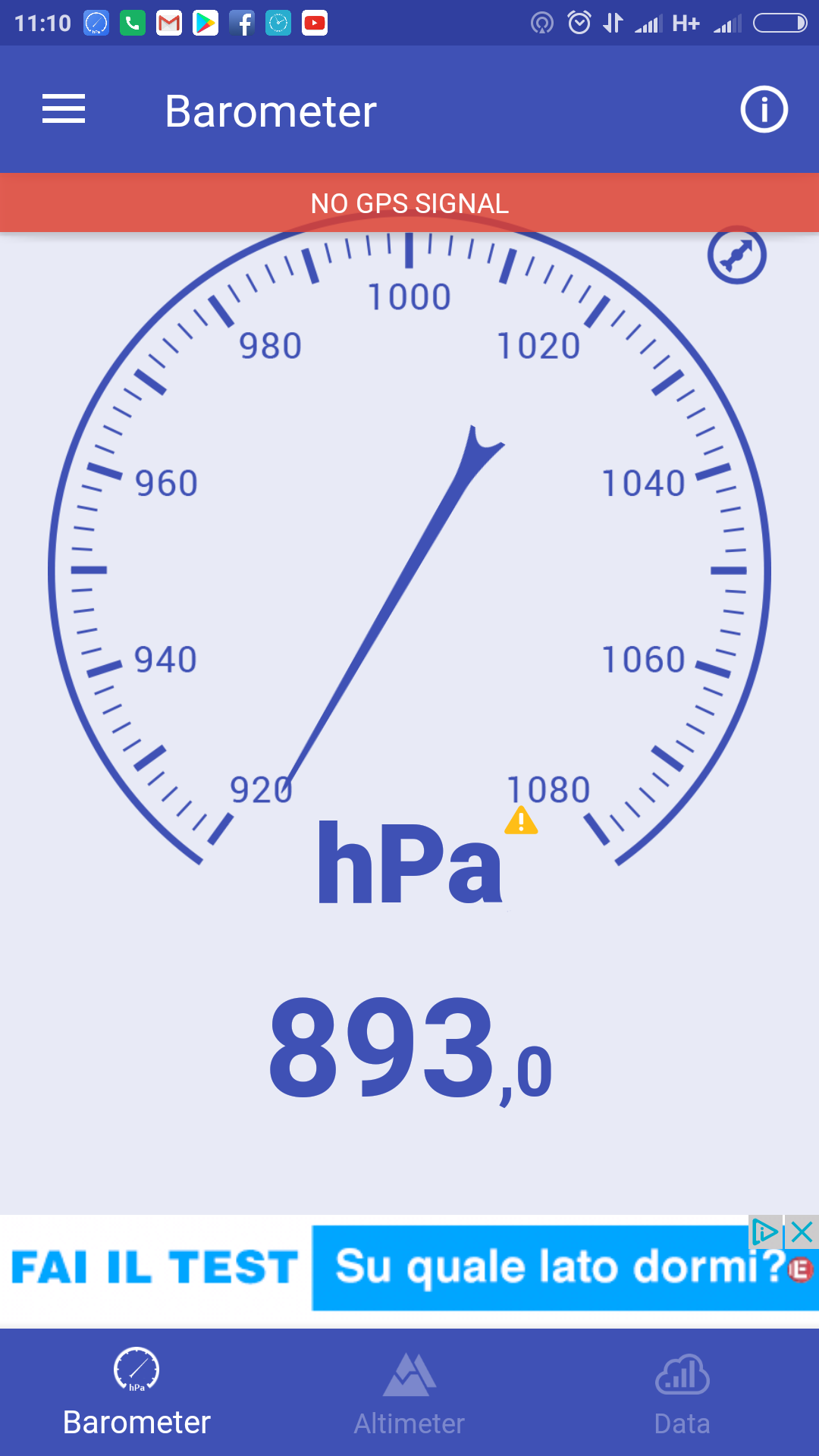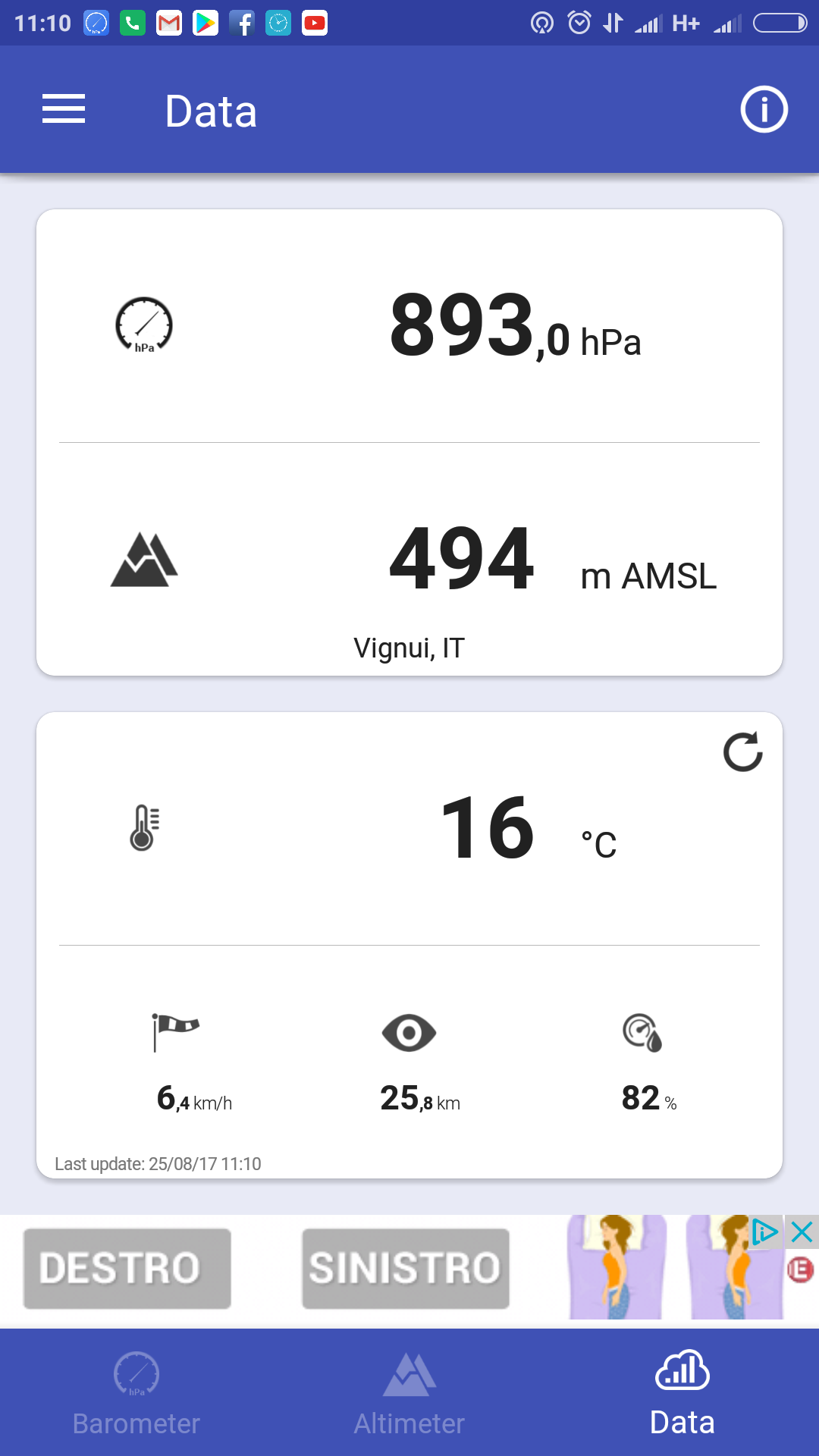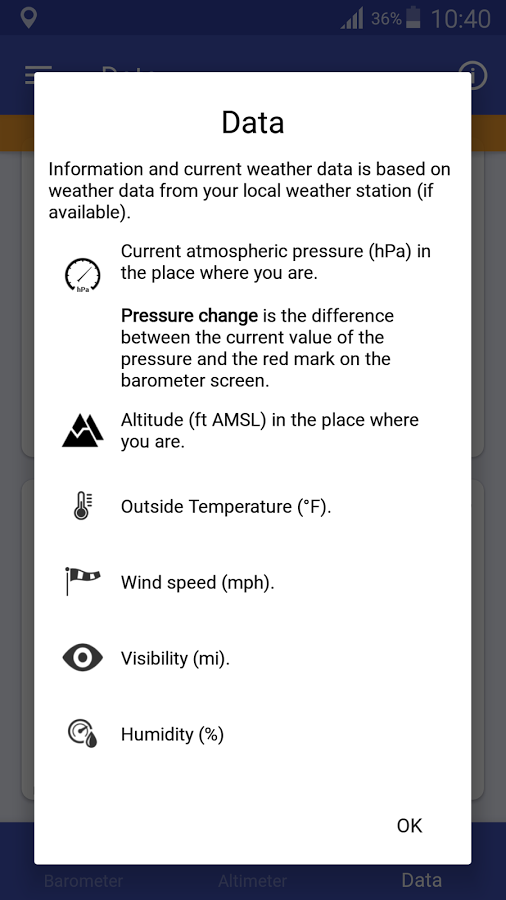 I dati visualizzati sono frutto dei sensori presenti nel dispositivo mobile, ovvero il GPS e il barometro. In caso quest’ultimo non sia disponibile nel terminale, i dati saranno meno accurati in quanto l’app si baserà sui dati provenienti dalle stazioni meteo locali, se disponibili.