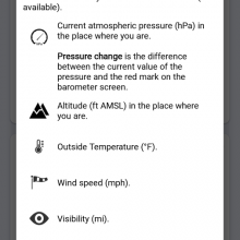 I dati visualizzati sono frutto dei sensori presenti nel dispositivo mobile, ovvero il GPS e il barometro. In caso quest’ultimo non sia disponibile nel terminale, i dati saranno meno accurati in quanto l’app si baserà sui dati provenienti dalle stazioni meteo locali, se disponibili.