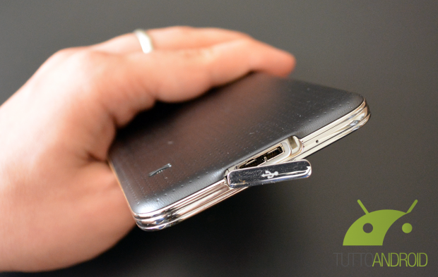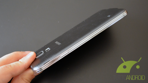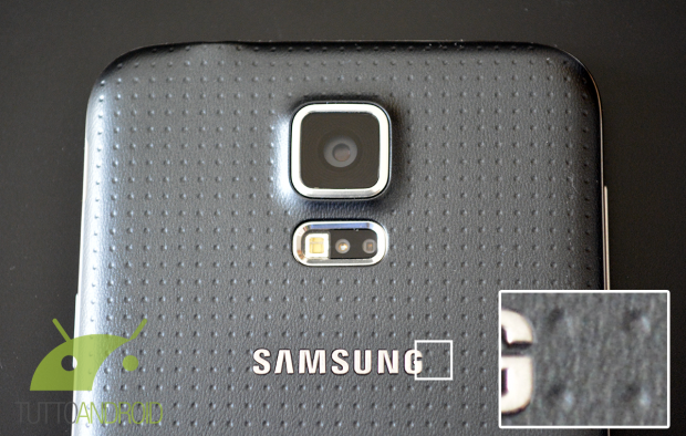 Samsung Galaxy S5 misura 142 x 72.3 x 8.13 mm, ciò vuol dire che è leggermente più grande di Galaxy S4 ma comunque più piccolo del Galaxy Note 3 (confronta ora le schede tecniche di S5, S4 e Note 3). Nel complesso dunque uno smartphone abbastanza grande di non facile impugnatura che fa ad inficiare negativamente sull’ergonomia. Di positivo c’è però che il tasto di accensione/spegnimento si trova sul fianco destro a portata di pollice (o di indice in base alla mano utilizzata) e che la cover sul resto è finalmente (dopo 4 generazioni di plastica lucida/ruvida) rivestita di uno strato gommoso che offre un ottimo grip e dunque un’impugnatura bella salda.