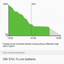 Mediamente siamo sempre riusciti ad arrivare a sera inoltrata sia con utilizzo medio che con utilizzo molto intenso, ciò che influisce di più sui consumi è il collegamento alla rete dati quando siamo in movimento. Spostandoci spesso in città la batteria scende velocemente e dovremo fare ricorso al risparmio energetico per riuscire a passare le 4h di display, anche con utilizzo blando. Mentre se staremo spesso collegati ad una rete WiFi potremo superare agevolmente le 5h di display acceso con utilizzo medio e addirittura le 6 ore con una giornata stress.
