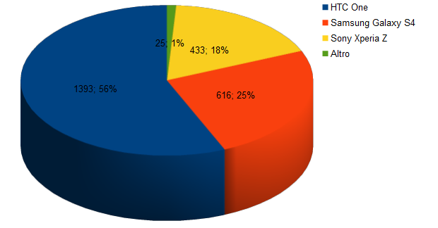 Quello che ha ottenuto il punteggio più elevato è stato l’HTC One, che ha vinto con un ampio margine sul secondo in classifica, cioè il Galaxy S4. Tra i due vi è una differenza abissale: 1393 voti del One contro 616 voti del Galaxy S4, quindi più del doppio ad appannaggio del nuovo smartphone di casa HTC. Il divario cresce ancora di più se si parla di Xperia Z, il quale ha ricevuto soltanto 433 voti. Solo l’1%, poi, dei nostri lettori avrebbe votato altri dispositivi. Tutti i dati sono stati riportati sul nostro grafico, dove a sinistra vi sono i voti totalizzati ed a destra le percentuali.