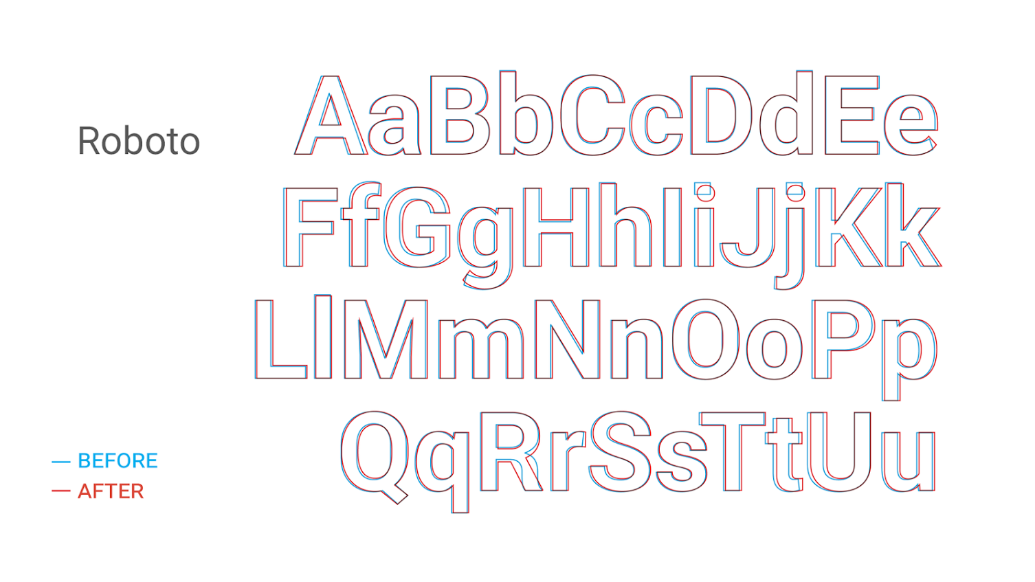 Come si può notare dall’immagine, il carattere di colore celeste è quello nella precedente versione, mentre quello di colore rosso è quello nella nuova versione. Si nota subito che caratteri come “A, e, F, f, G, g, H, h, i, J, j, K, k, P, p, Q, R, r, S, T, t, U, u” presentano delle differenze molto marcate tra la versione precedente e quella attuale di Roboto, mentre per altri caratteri si sono visti cambiamenti minimi. Lettere ad esempio come “d, o, l, b, a, s” e poche altre sembrano essere praticamente identiche a quelle precedenti, mentre quei caratteri che sono stati modificati più radicalmente sembrano essere “K” ed “R”. Mancano però all’appello alcune lettere, come “z, x, y, w”, e sul motivo di questa mancanza si può solamente speculare.