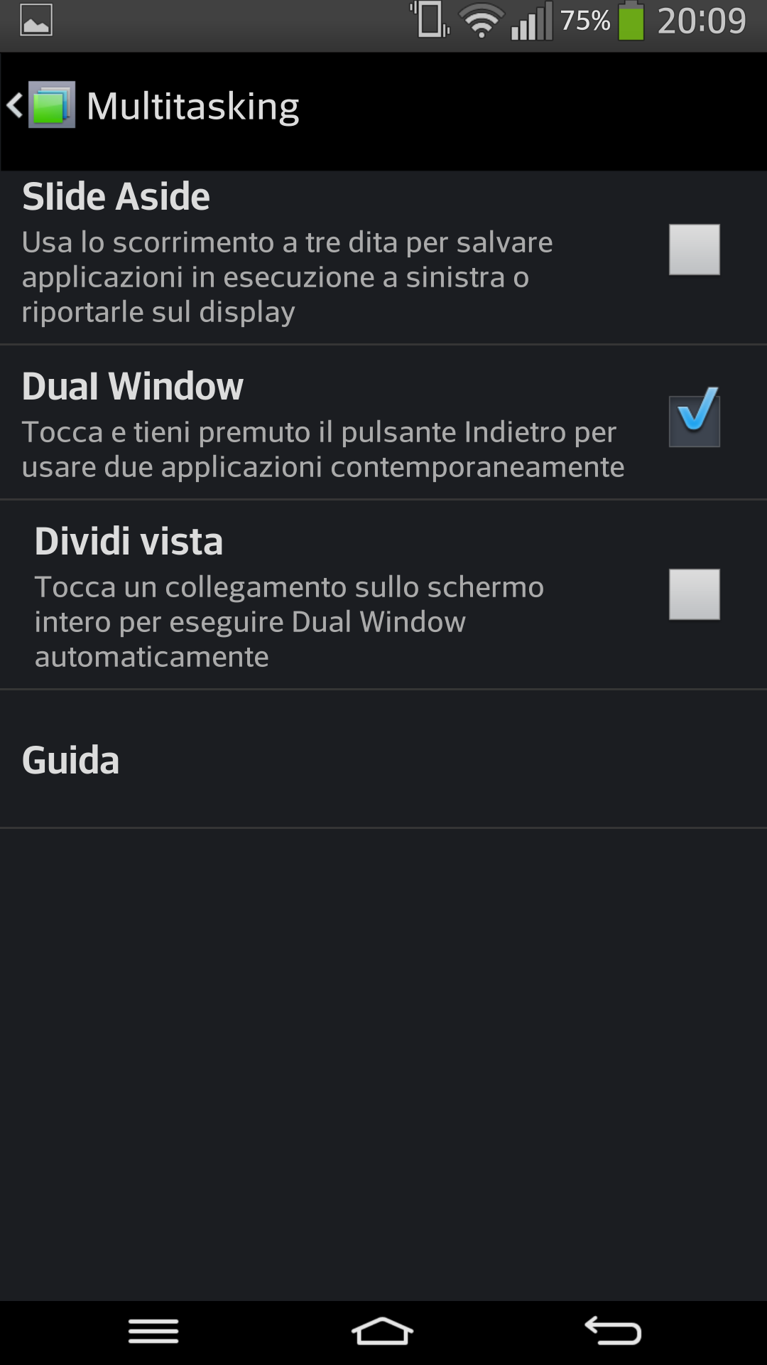 La prima riguarda il multitasking, ed è una gesture elaborata da LG che permette di lasciare in esecuzione tre app a scelta, facendole scorrere con tre dita verso il lato sinistro dello schermo. Una notifica tiene il conto delle applicazioni tenute aperte lateralmente, che possono essere richiamate con la stessa gesture a tre dita ma verso destra. La feature in sé è molto interessante ma l’obbligo di utilizzare contemporaneamente tre dita ne rende l’utilizzo difficoltoso e di conseguenza resta il più delle volte inutilizzata.