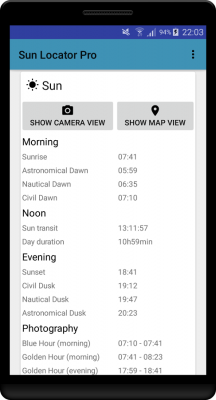 Sun Locator Pro è disponibile per Android al prezzo di € 2,79 senza acquisti in-app e richiede le autorizzazioni per l’accesso alla posizione a alla fotocamera. Se volete testare il prodotto è disponibile anche la versione free che è però limitata alle informazioni relative al giorno corrente.
