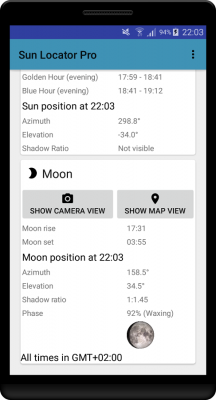 Sun Locator Pro è un’applicazione che predice la posizione e il percorso di sole e luna durante il giorno corrente o in qualsiasi giorno dell’anno in una determinata posizione, basata sulle informazioni fornite dal gps oppure a scelta dell’utente.