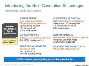 Grazie ad un documento trapelato da Qualcomm ora abbiamo uno sguardo verso il futuro di ciò che la società ha deciso per la sua famosa linea di processori Snapdragon. I nuovi MSM8930/8960/8270 e APQ8064 saranno tutti in grado di raggiungere velocità di 2.5 Ghz, supporteranno l’elaborazione quad-core, fotocamere da 20 Megapixel, hardware 3D e saranno 5 volte più veloci di quelli attuali. La GPU “onboard” Adreno offrirà grafica di qualità andando a competere con Nintendo 3DS e Playstation Portatili future.