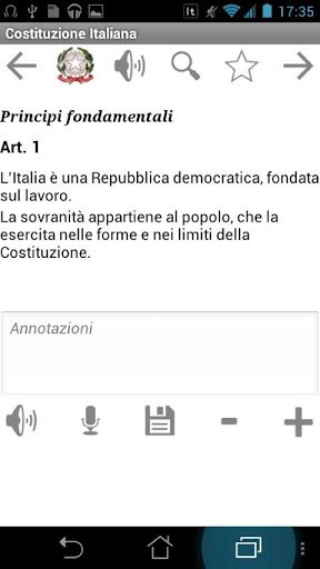La prima icona vi permette di tornare al menu principale, mentre la seconda vi consentirà di utilizzare lo strumento text to speech per attivare il lettore vocale che vi leggerà il contenuto ad alta voce. Non manca la possibilità di inserire l’articolo tra i propri preferiti, effettuare una ricerca per individuare una legge e, tra le tante caratteristiche, abbiamo anche la possibilità di aggiungere annotazioni.