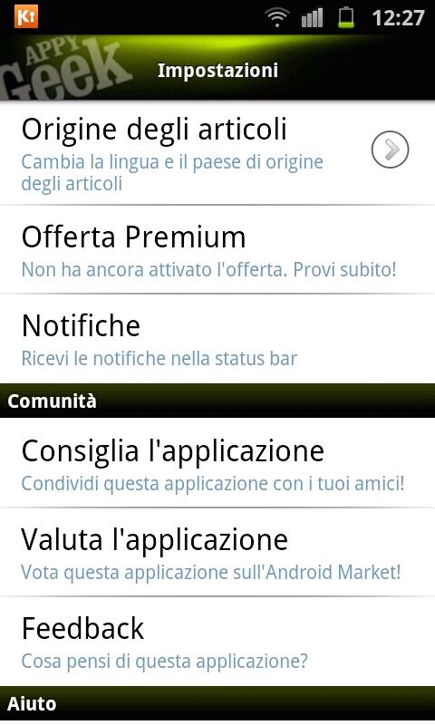 Non mancherà la possibilità di impostare degli alert sul vostro dispositivo Android per essere informati sugli argomenti preferiti e APPY Geek vi permette anche di condividere l’articolo su Facebook e Twitter. Esiste anche una versione di APPY Geek Premium che vi consentirà di dire addio alle pubblicità. Dovrete pagare la piccola somma di 2,99 euro per tre mesi di promozione. Per attivare tale opzione, dovrete recarvi nel pannello delle impostazioni. Sempre in questo spazio, troverete altre opzioni, come la possibilità di stabilire l’origine degli articoli, le notifiche, consigliare l’applicazione, valutarla ed altro ancora!