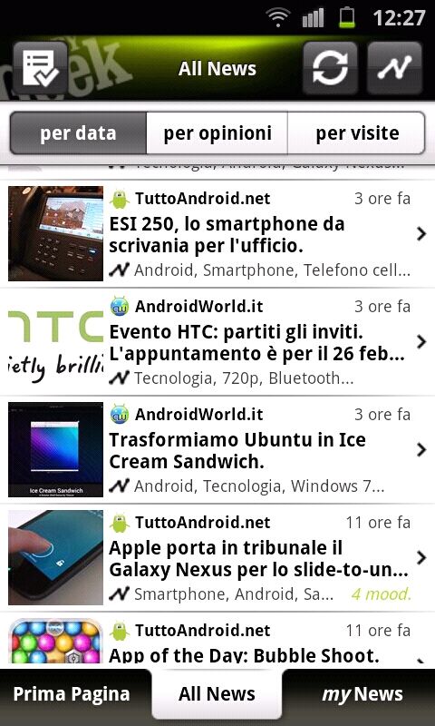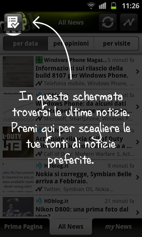 Nella schermata All News, invece, saranno presenti le ultime notizie ed anche qui avrai massima gestione. Come vi indicherà l’applicazione, difatti, potrete selezionare il bottoncino in alto a sinistra per scegliere le fonti da cui attingere informazioni. Troverete portali davvero interessanti, ovviamente nell’elenco non poteva mancare TuttoAndroid.net! Sempre in questa sezione, avrete l’occasione di visualizzare le notizie in vari ordini: per data, per opinioni e per visite.