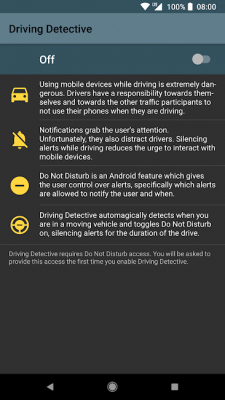 Driving Detective è un’applicazione che ha il proposito di contribuire alla sicurezza durante la guida attivando e disattivando automaticamente la modalità “non disturbare” per limitare le distrazioni del conducente causate dall’utilizzo dello smartphone in auto.