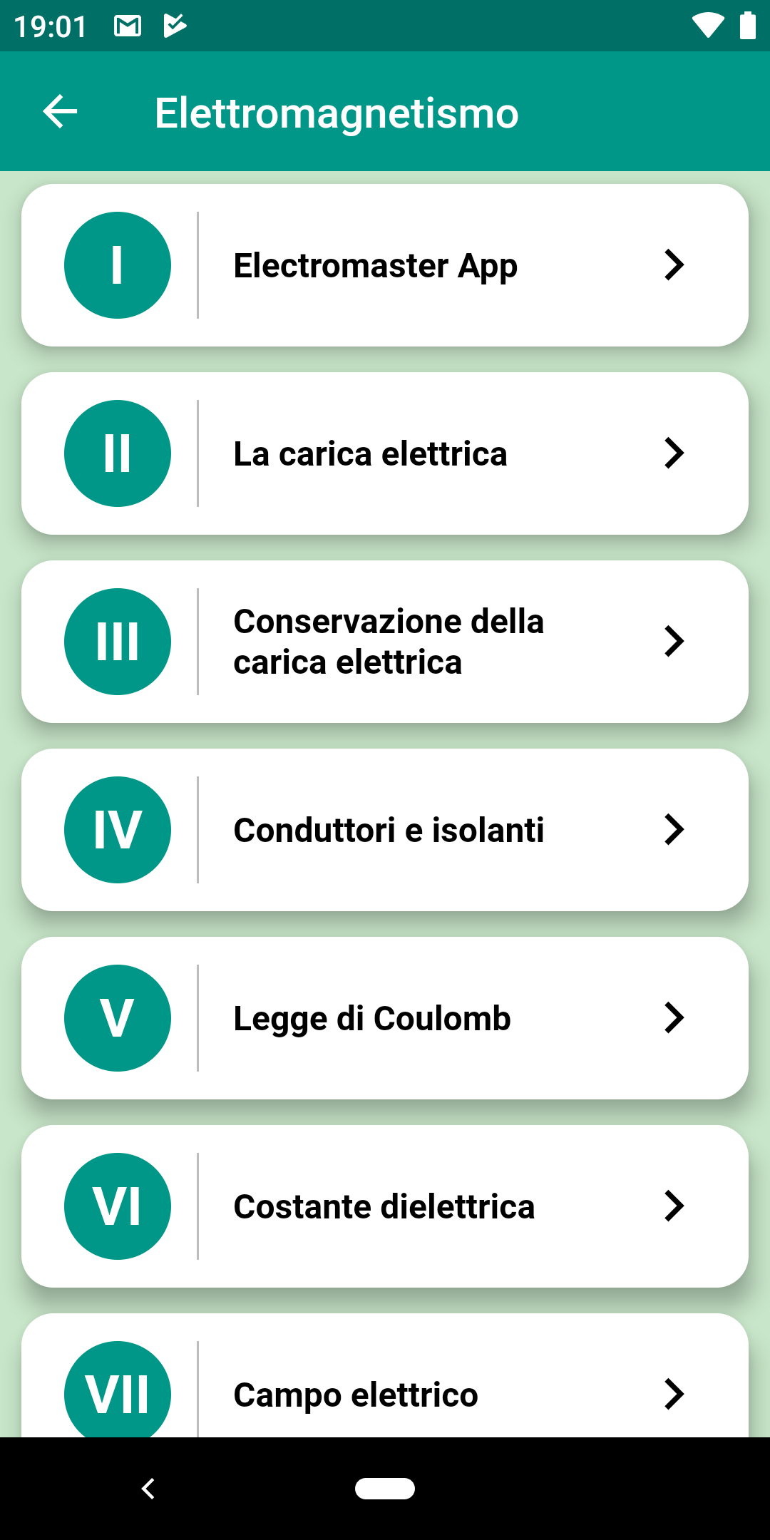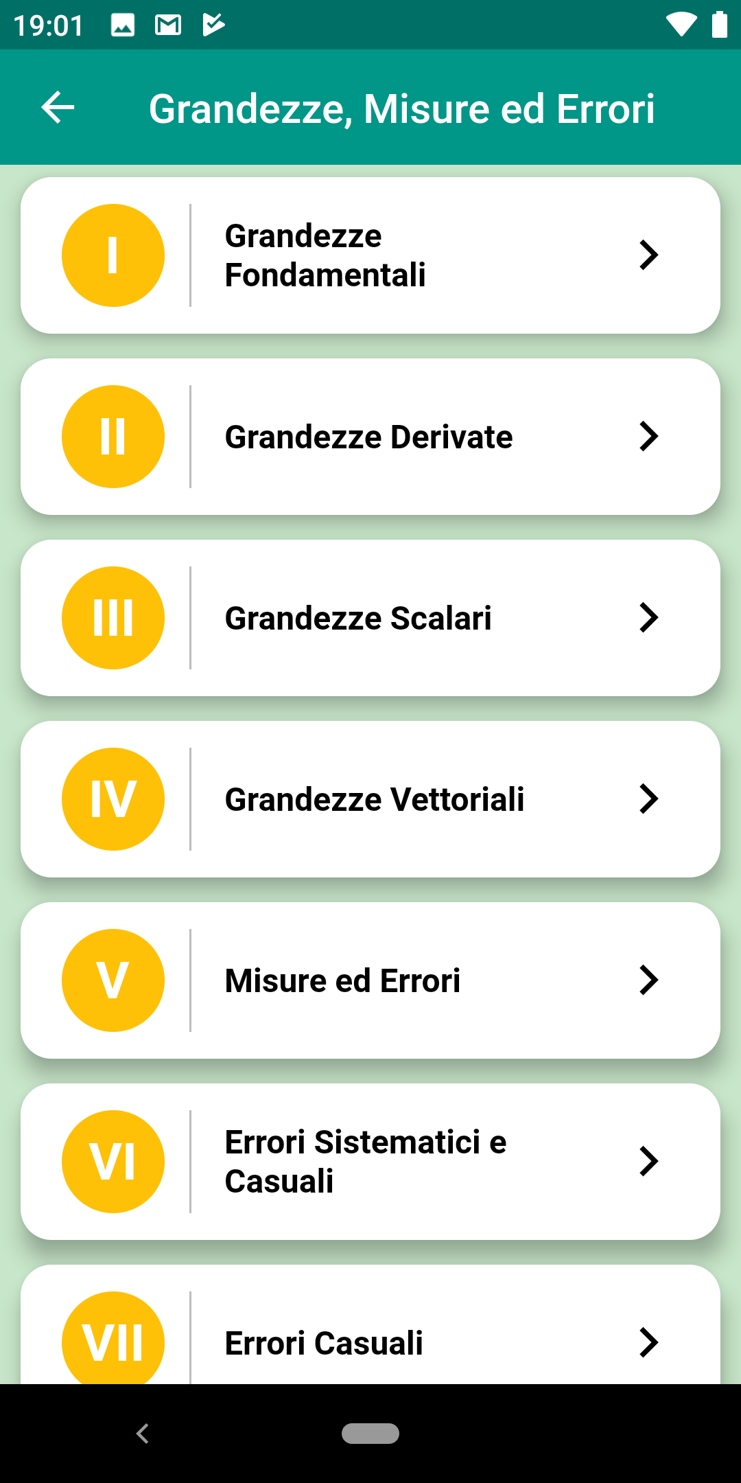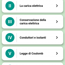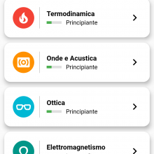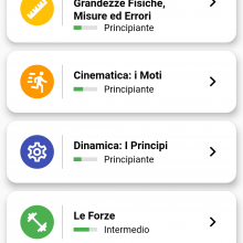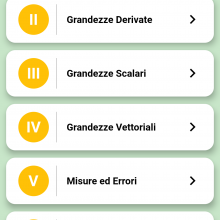 Gli argomenti presenti nell’applicazione sono oltre 60 tra i quali: grandezze fondamentali, derivate, scalari, vettoriali, misure ed errori sistematici e casuali, velocità e accelerazione media e istantanea, moto rettilineo, circolare, armonico, forze, leggi di Keplero, legge di gravitazione universale,  cambiamenti di stato della materia, termodinamica, fluidodinamica, energia, carica elettrica, onde elettromagnetiche ecc.