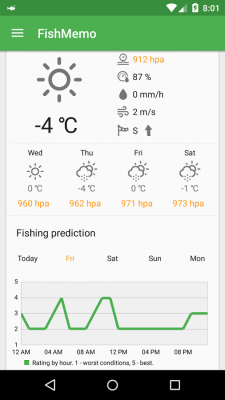 Una menzione a parte merita la funzione che fornisce delle previsioni di pesca giornaliere, la quale dà informazioni sulla pescosità tenendo conto di alcuni parametri, come le condizioni meteo.