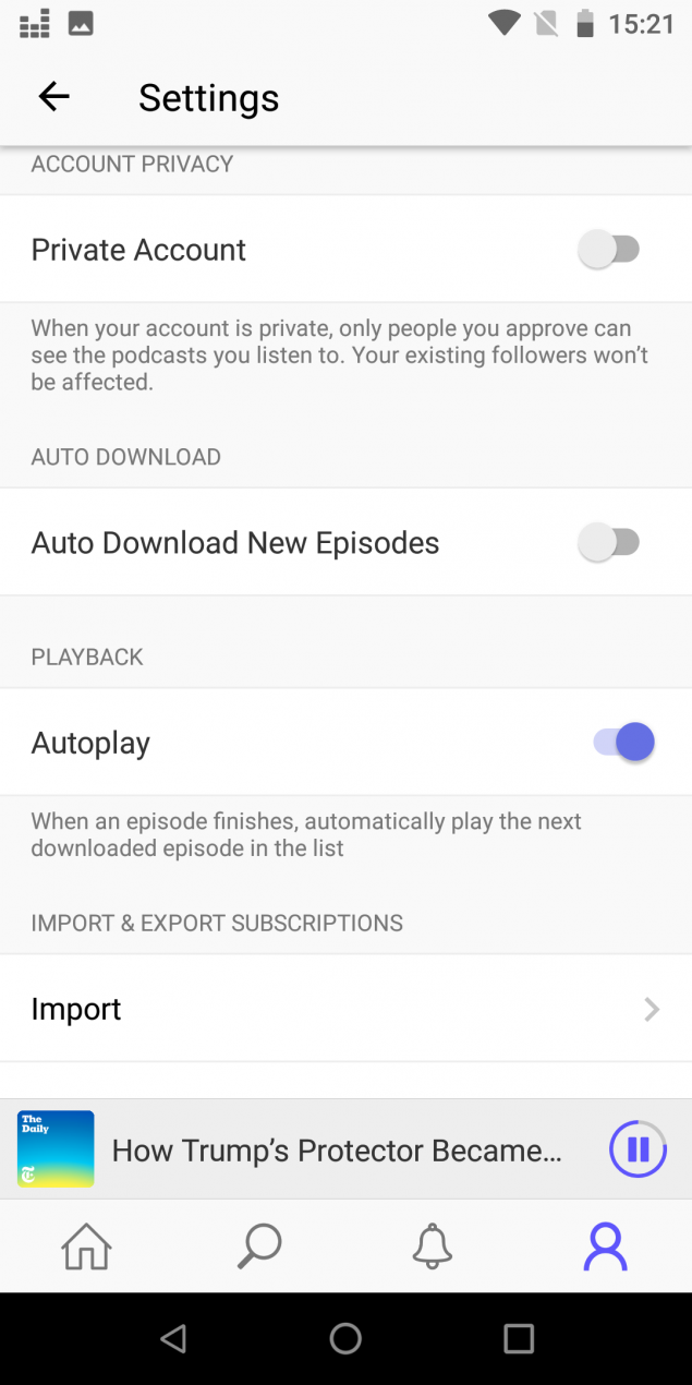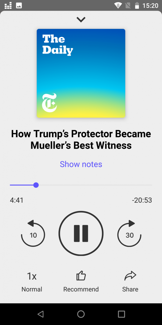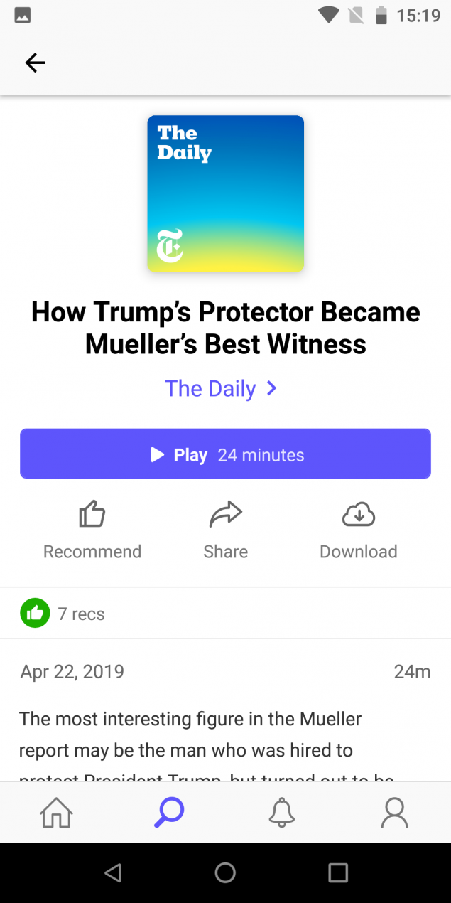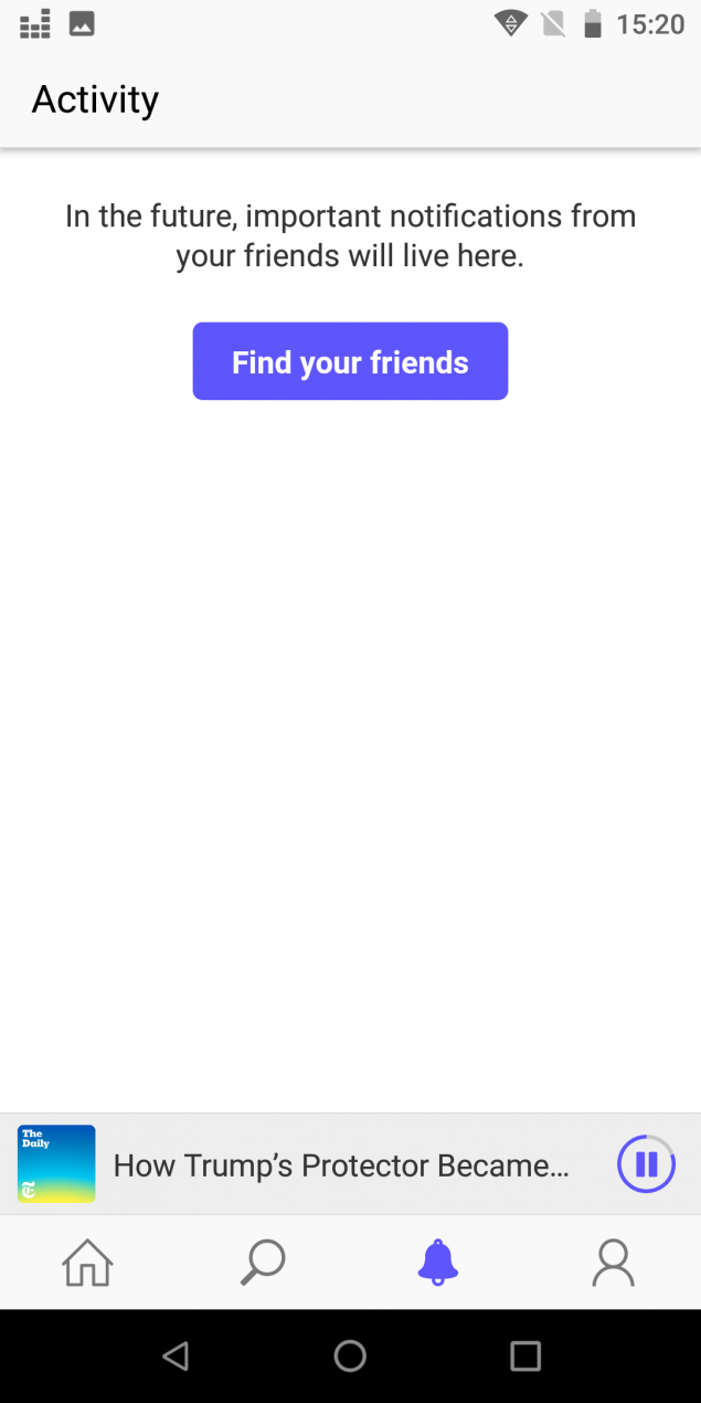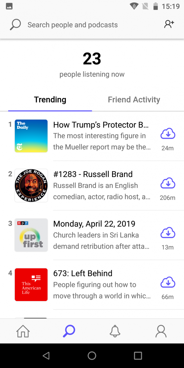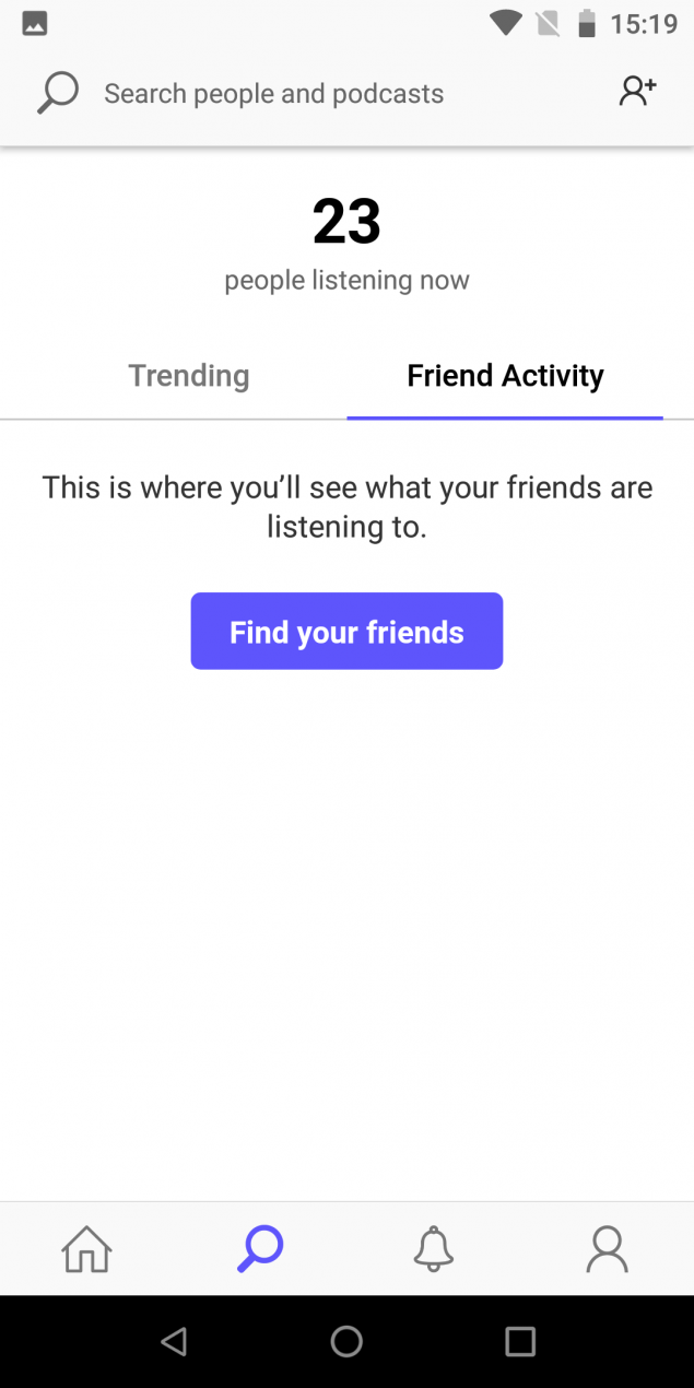 L’app chiede di collegare i vostri account Facebook e Twitter e il vostro elenco di contatti e successivamente potrete scegliere di seguire gli amici che utilizzano l’app, con la possibilità di vedere cosa stanno ascoltando in un feed di attività in cui delle piccole icone verdi appaiono accanto all’avatar di una persona ogni volta che ascolta almeno il 20% di un episodio.