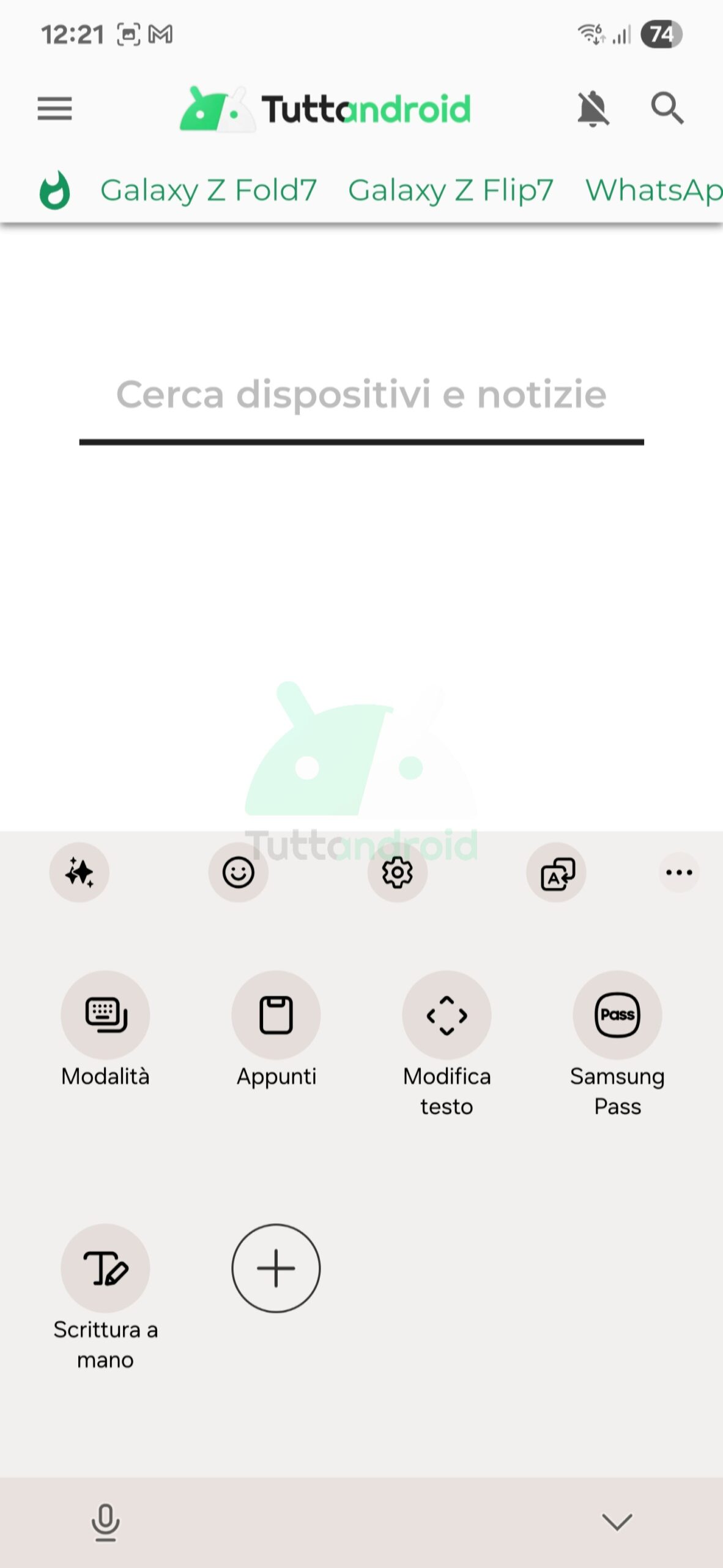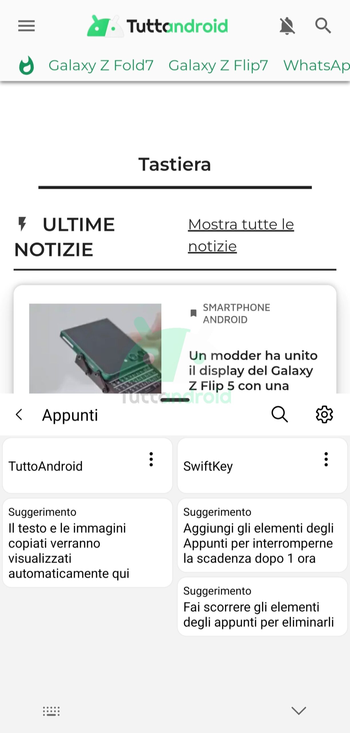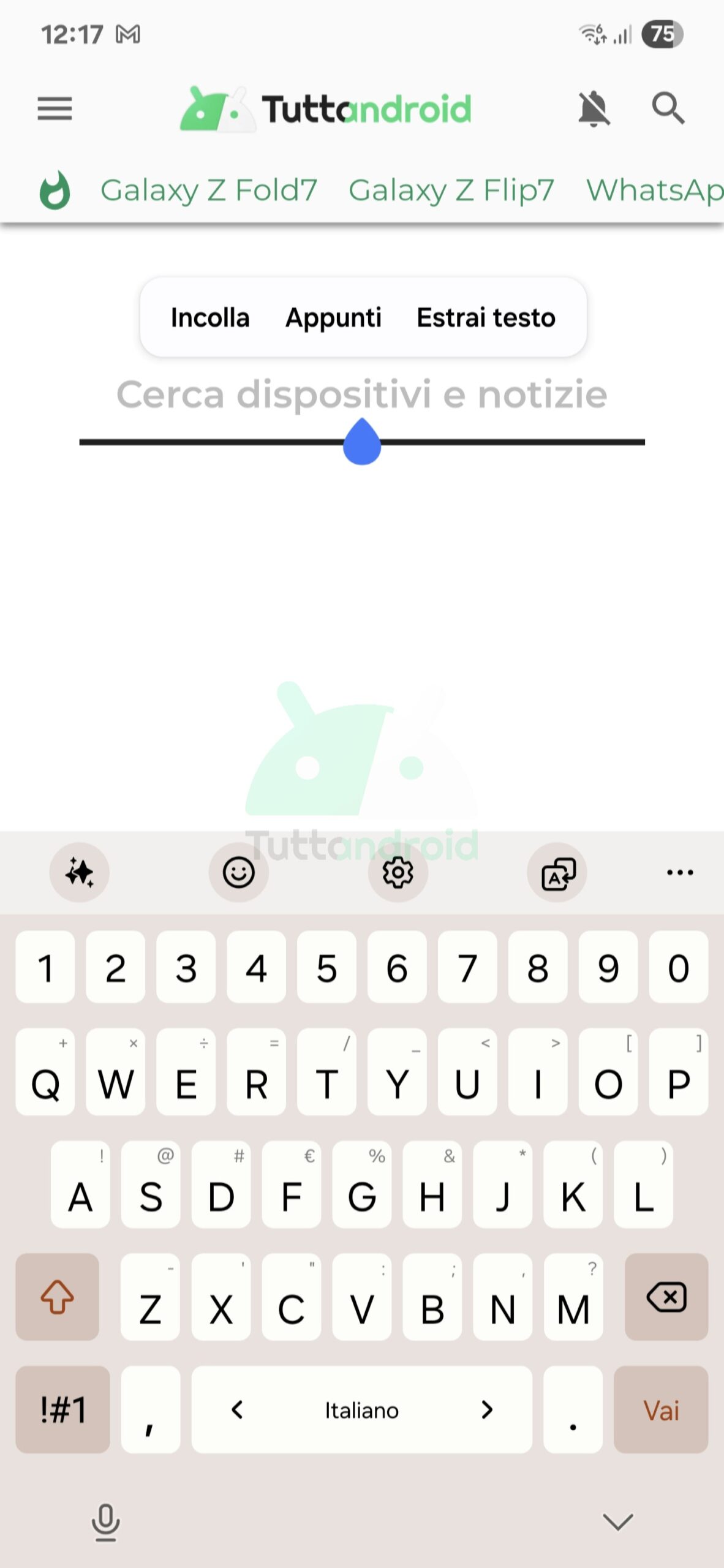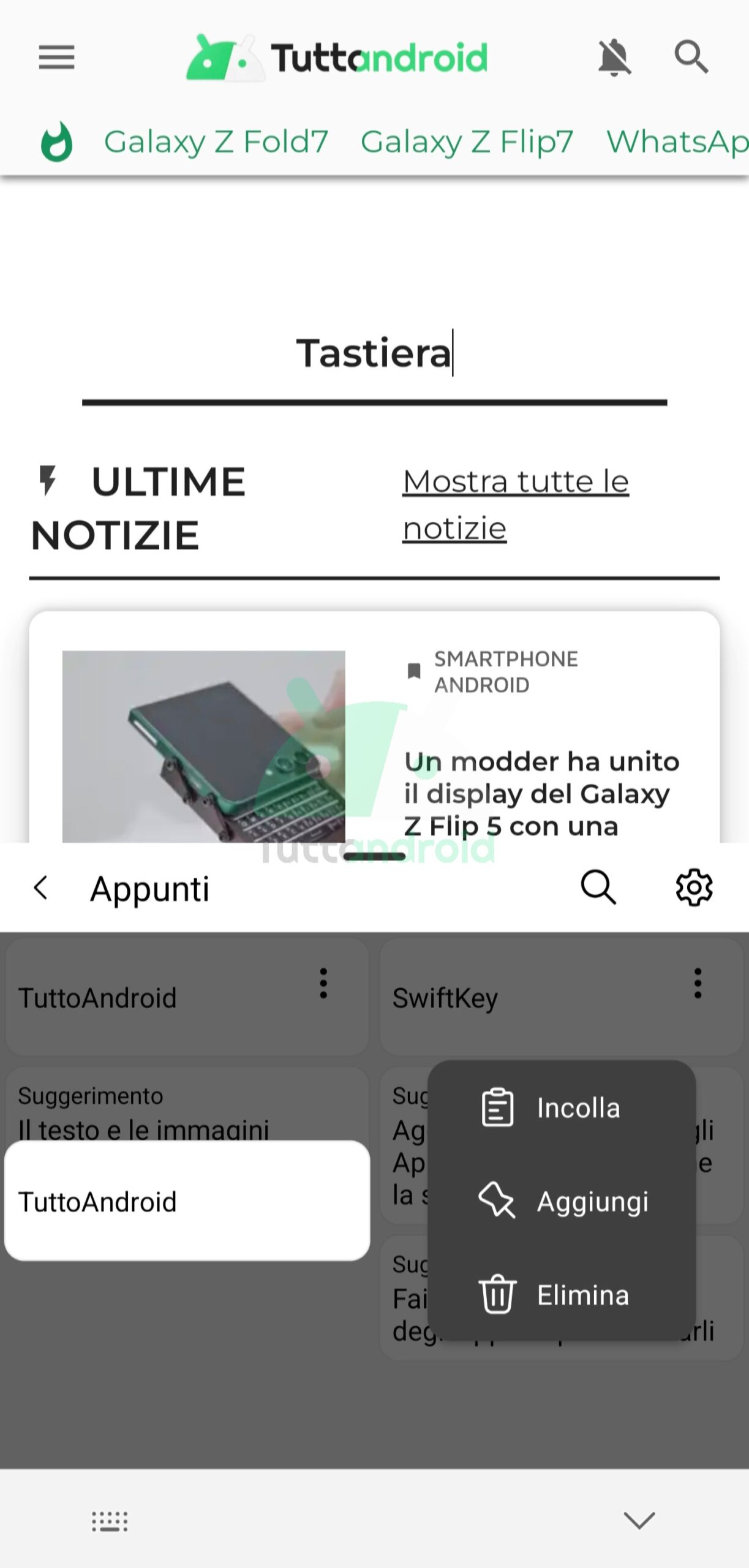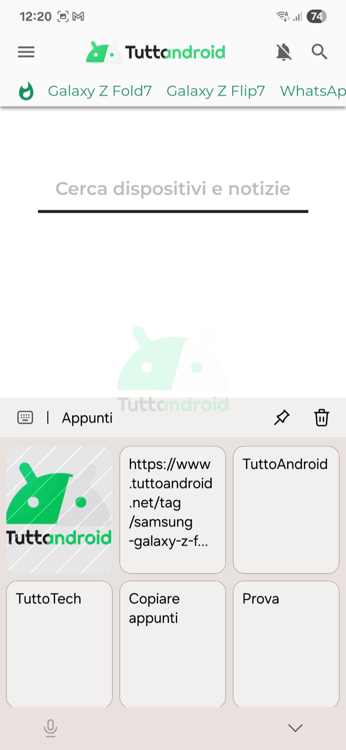 Nella sua personalizzazione, One UI, Samsung offre la possibilità di tenere da parte tutto il testo copiato e anche gli screenshot salvati attraverso la Tastiera Samsung; per accedervi è sufficiente tenere premuto dove si va normalmente a scrivere (barra di ricerca del browser, WhatsApp, etc. etc.) e selezionare “Appunti”. o in alternativa scorrere tra le opzioni fino a individuare proprio quest’ultima voce (con relativa icona). Quella che vedete qui in basso è in particolare la sezione presente sulla One UI 7, ma non troviamo grosse differenze tra le varie versioni.