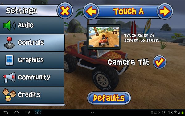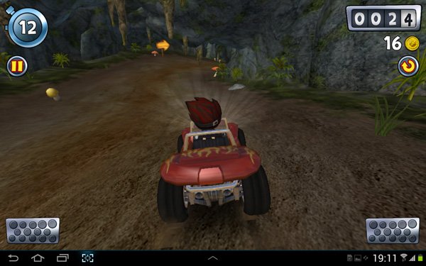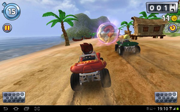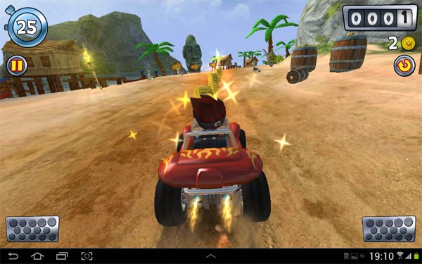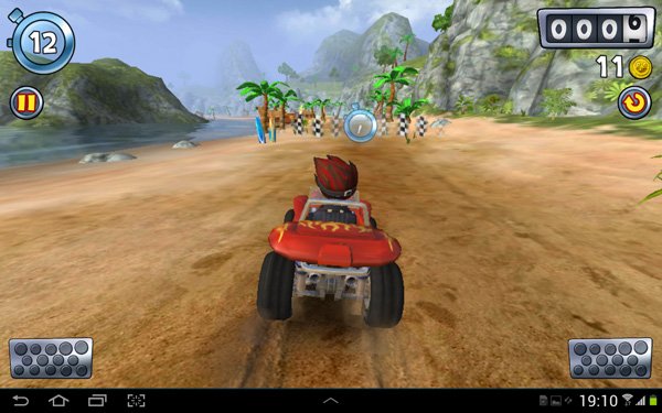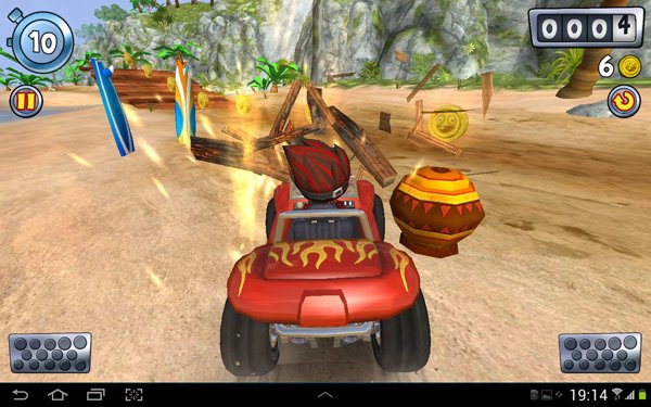 Beach Buggy Blitz vi offre la possibilità di utilizzare i controlli tilt del vostro dispositivo oppure vi consente di optare per l’ormai classico metodo touchscreen. Questo ultimo vi farà comparire i pedali dei freni, ma per svoltare a destra e sinistra dovrete compiere dei tap sui laterali dell’interfaccia.
