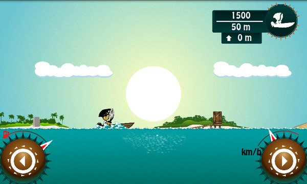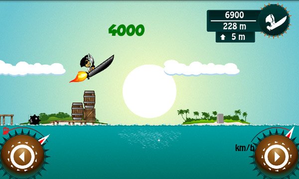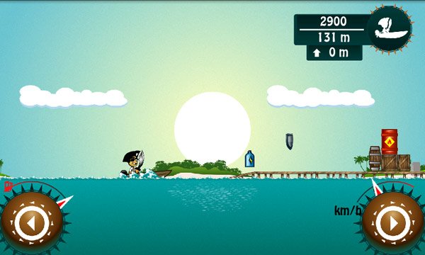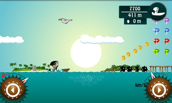 Molto simpatico il sistema di controllo del gioco. Sono presenti due bottoni touchscreen che vi consentono di rallentare o accelerare. Potrete usarli anche in volo per riequilibrare la barchetta che non dovrà mai finire in acqua sottosopra! Divertente la possibilità di compiere acrobazie, ma non vi illudete di ottenere maggiori punti effettuando queste mosse speciali che, a quanto pare, serviranno solo per far divertire il pirata!