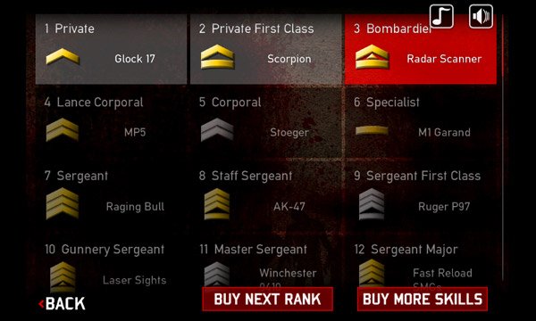 I mostri da abbattere avranno una resistenza diversa e, durante le missioni, potrete incontrare 9 tipi di zombie. Ogni giocatore avrà una propria esperienza, forgiata in base alle missioni portate a termine, evidenziabile attraverso i gradi che in totale saranno 40. Questi ultimi saranno sbloccati dopo ogni vittoria, oppure potranno essere acquistati con soldi reali. La conquista di tali titoli vi consentirà di comprare delle nuove armi.