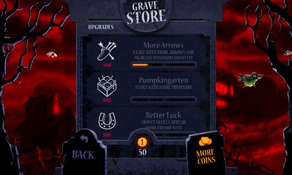 Il denaro vi servirà per fare un po’ di shopping dal macabro negozio. Avrete l’occasione di comprare più frecce iniziali, nuove vite e molto altro. Per avere maggiore denaro potrete anche compiere alcune azioni sociali che vi consentiranno di ottenere nuove monete a prezzo zero.