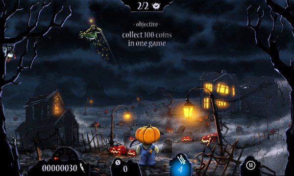 Anche le schermata del menu saranno avvolte da un’atmosfera macabra, ma allo stesso tempo interessante. La home vi mostrerà papà zucca mentre guarda i suoi figli giocare allegramente in quello che sembra essere un cimitero. Le voci di menu, per rimanere in tema, saranno posizionate su una lapide. Avrete la possibilità di lanciare il gioco, di accedere allo store oppure di condividere il gioco sui maggiori social network o, ancora, di dare uno sguardo ai credits e agli altri game dello sviluppatore.