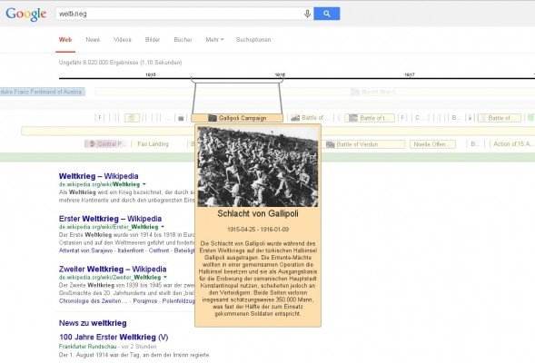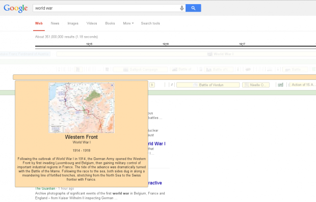 Il funzionamento della timeline sembra essere semplice: non appena l’utente esegue una ricerca, il sistema restituisce automaticamente una sorta di raccolta di risultati raggruppati in ordine cronologico. Cercando informazioni sulla Prima Guerra Mondiale, ad esempio, si ottiene una pagina simile alla seguente: