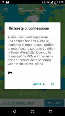 Ora sarà necessario collegare la VPN e assicurarsi di impostare “Stati Uniti” come punto d’arrivo. Su Tunnelbear basta cliccare su “Connect” attraverso lo switch in alto, aspettare la connessione e cliccare su OK quando ci verrà richiesto l’accesso al VPN.