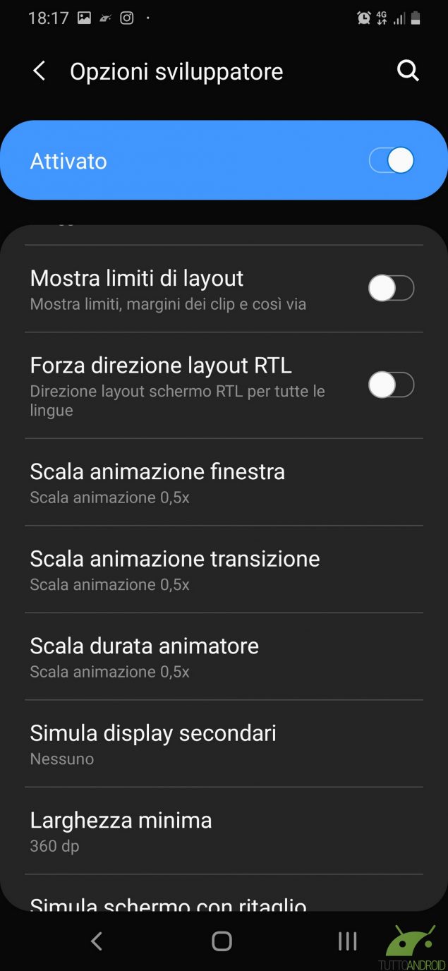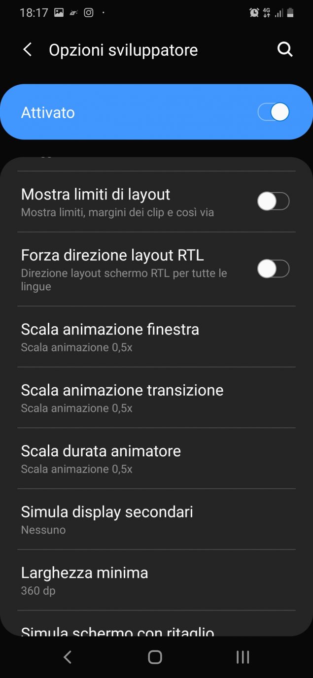 - Attivate le opzioni sviluppatore con 7 tap successivi sulla voce “build” che trovate all’interno della scheda “informazioni software” delle impostazioni di sistema, dopodiché entrate nella scheda “opzioni sviluppatore” che sarà comparsa nell’elenco delle impostazioni e scorrete nella parte basse fino a trovare le voci che riguardano le animazioni, sono 3. Impostatele con valore 0,5.