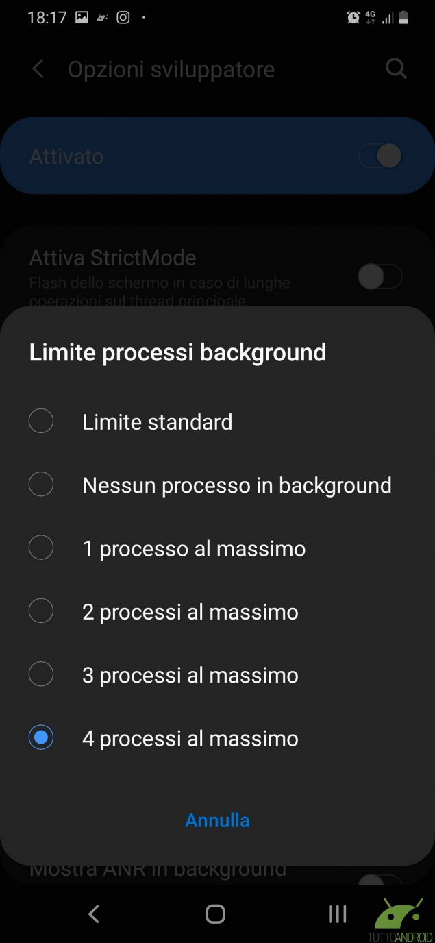 - A fondo pagina delle “opazioni sviluppatore” troverete la voce “limita processi in background”, potete provare a impostarla con il limite di 4 app. Si tratta di una modifica invasiva nella stabilità del sistema, procedete quindi per tentativi per capire se il vostro stile di utilizzo supporta il limite dei processi.
