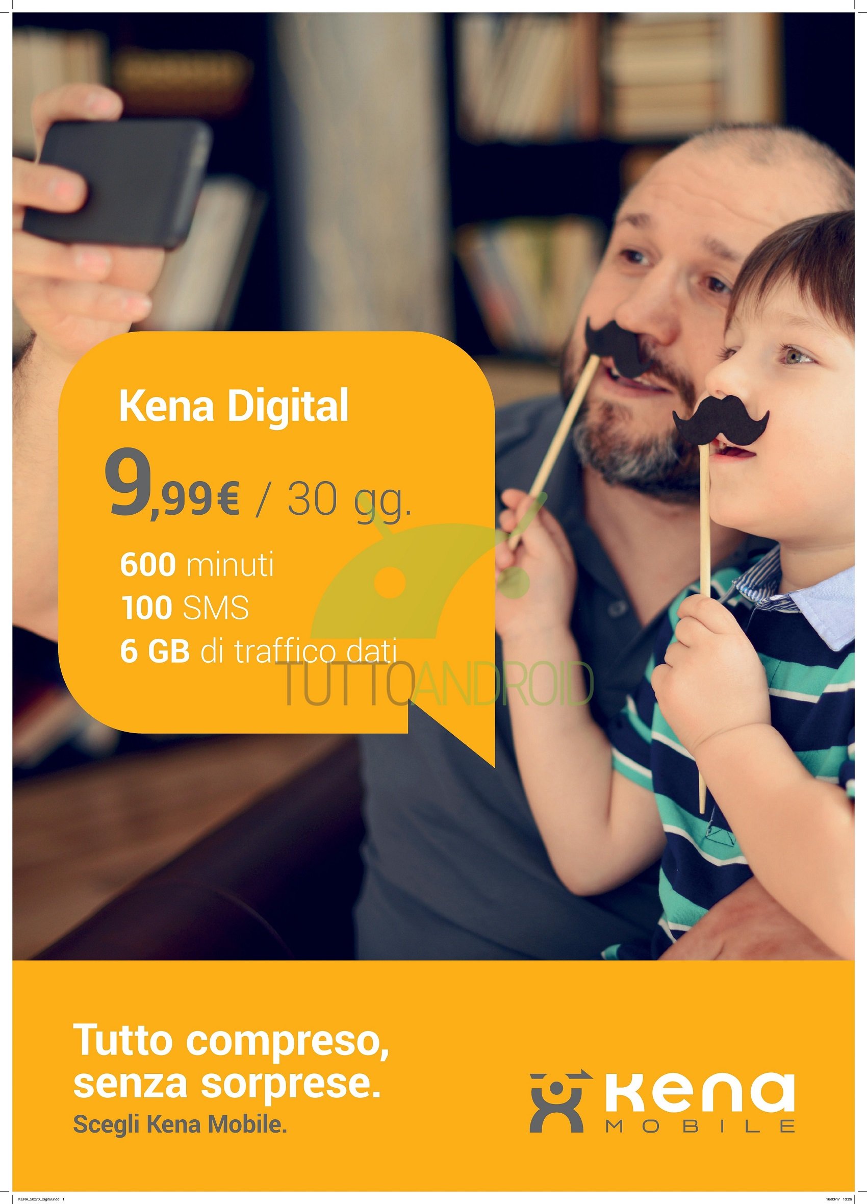 - Kena Digital: 600 minuti di chiamate, 100 SMS e 6 GB di traffico dati internet sotto rete 3G di TIM al costo di 9,99 Euro ogni 30 giorni.