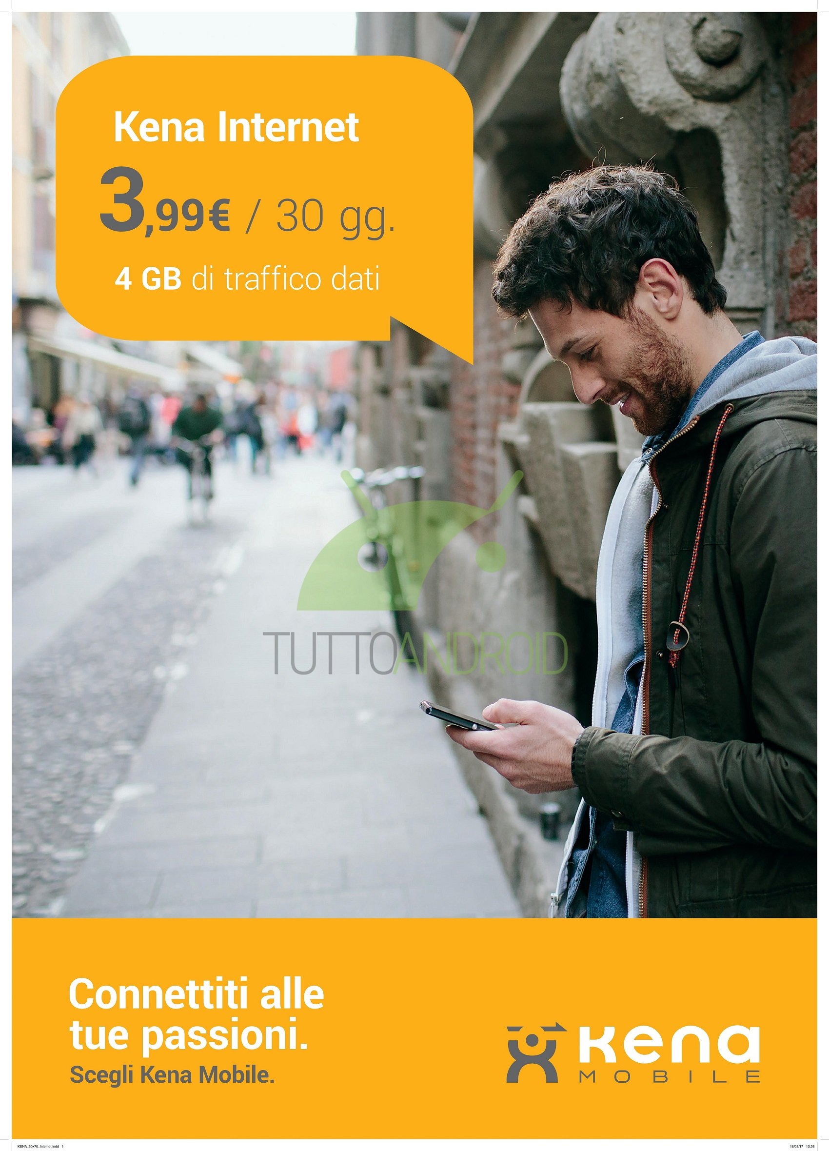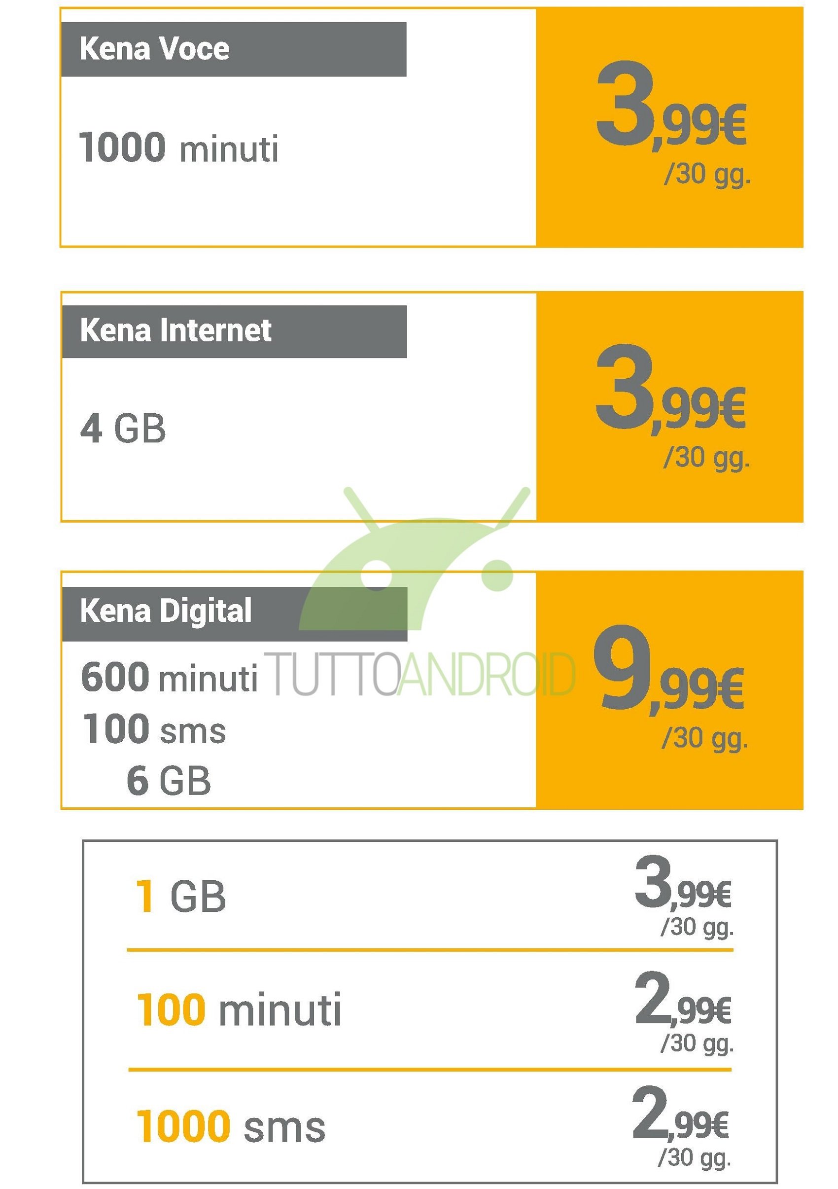 - Kena Internet: 4 GB di traffico dati internet sotto rete 3G di TIM al costo di 3,99 Euro ogni 30 giorni;