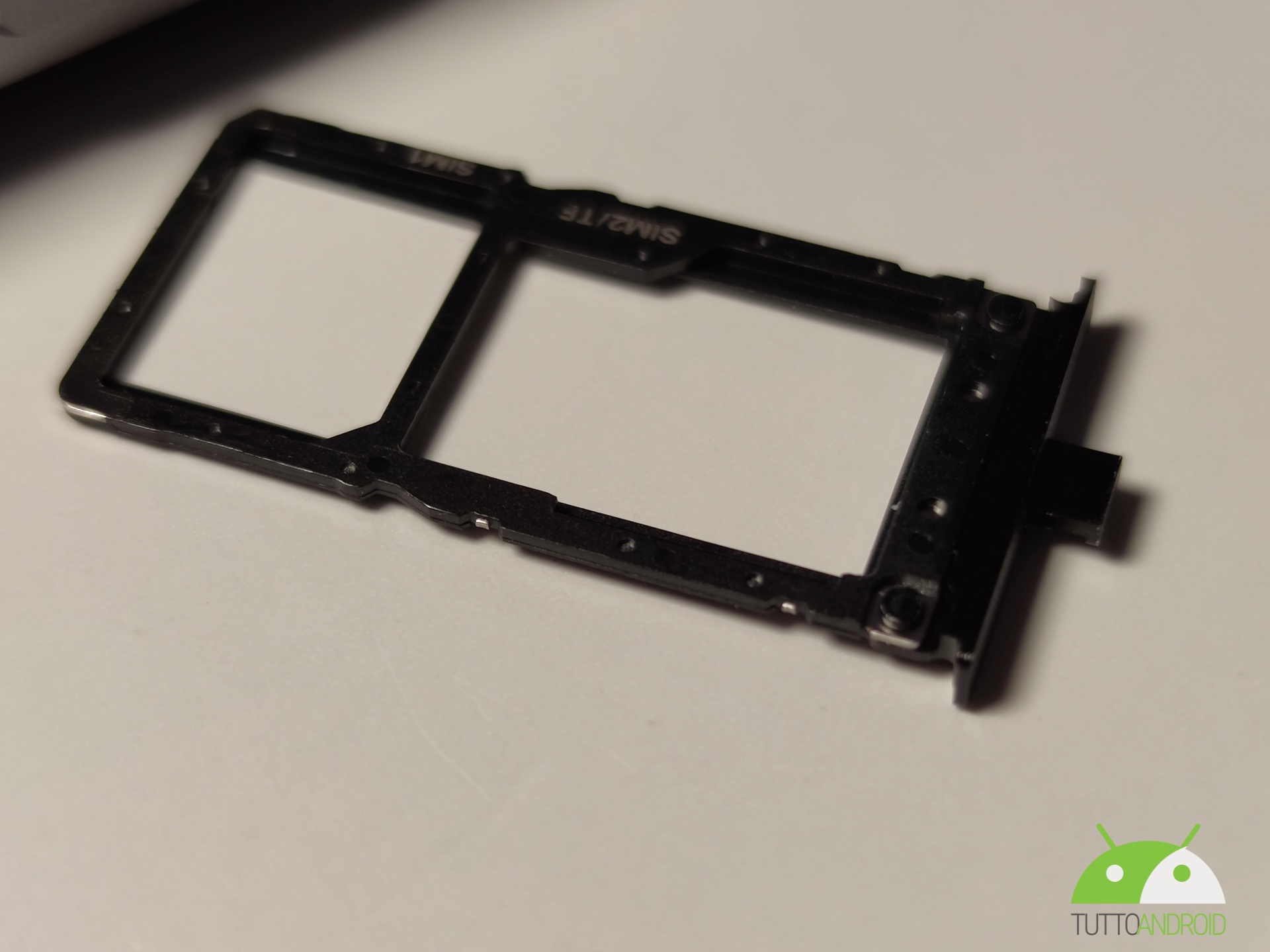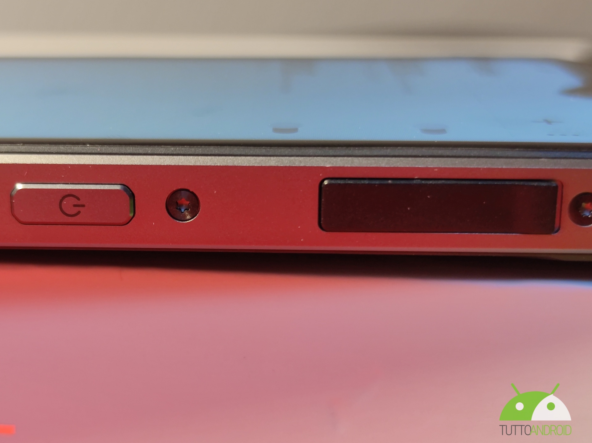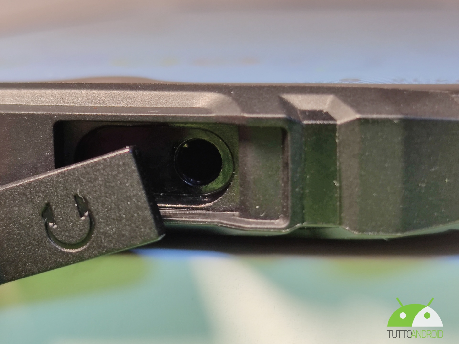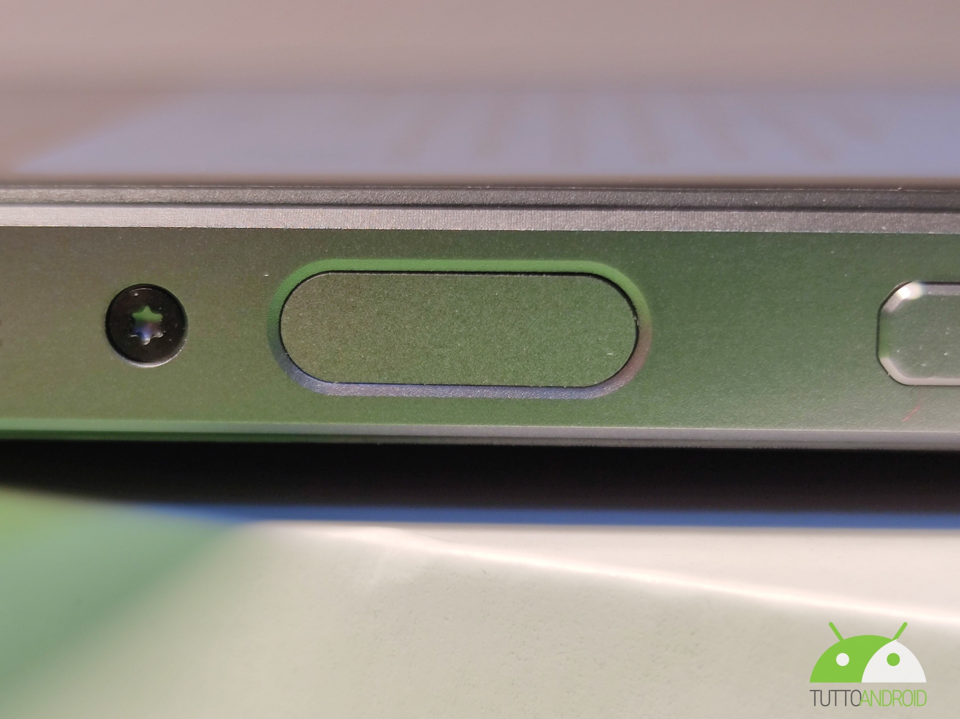 Un po’ caotica la disposizione dei tasti e dei connettori, ai quali comunque ci si abitua abbastanza in fretta. Nella parte alta, protetto da uno sportellino di gomma, è presente il connettore da 3,5 mm per le cuffie. Sul lato destro troviamo, partendo dall’alto, il carrellino della SIM, protetto da uno sportellino in gomma. Il carrellino può essere rimosso senza strumenti, grazie a una piccola sporgenza da tirare con l’unghia. Subito sotto ecco il tasto di accensione/sblocco e appena sotto il lettore di impronte digitali, che poteva essere integrato nel tasto di accensione per risparmiare spazio.