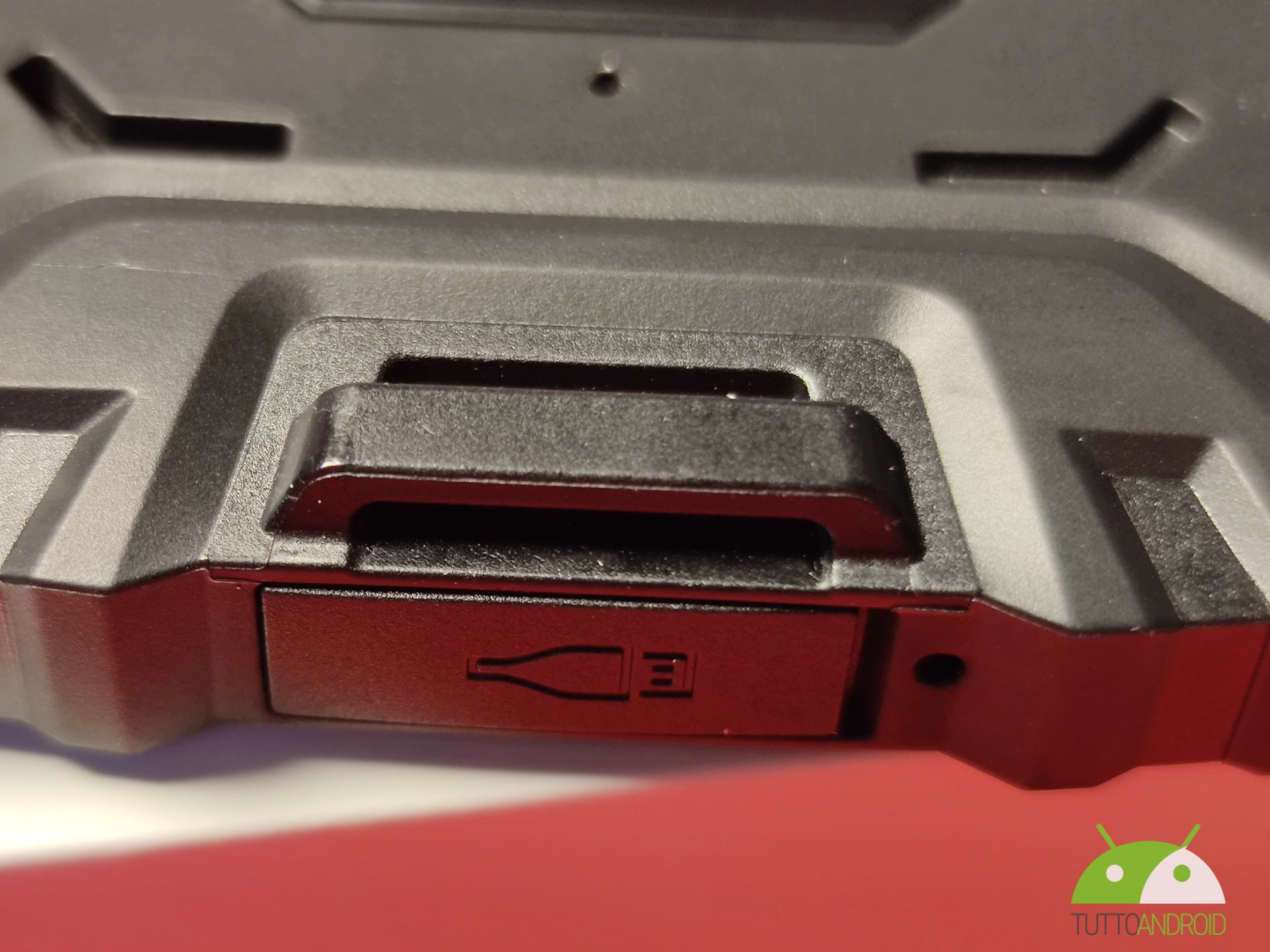 A sinistra invece abbiamo il bilanciere del volume e un tasto denominato Smart, le cui funzioni possono essere personalizzate. Peccato che siano limitate, avrebbe potuto fornire una marcia in più allo smartphone. In basso infine è presente il connettore per la ricarica, protetto da uno sportellino di gomma.